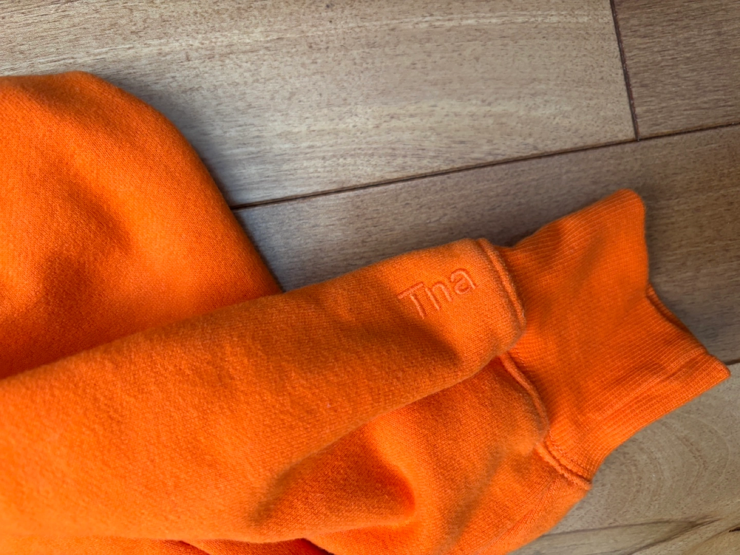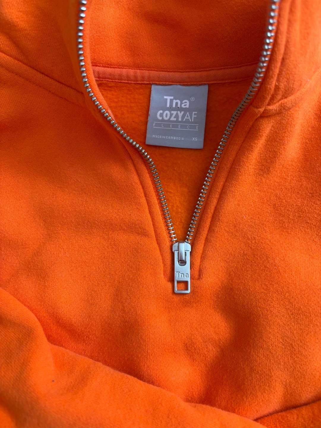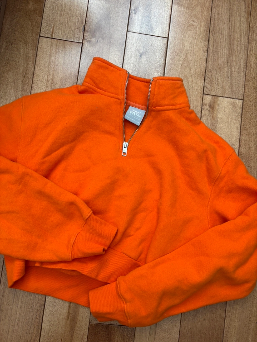 Bright orange cropped 1/4 zip pullover. Cozy fleece material. Small brand logo on sleeve and tag. Size extra small.