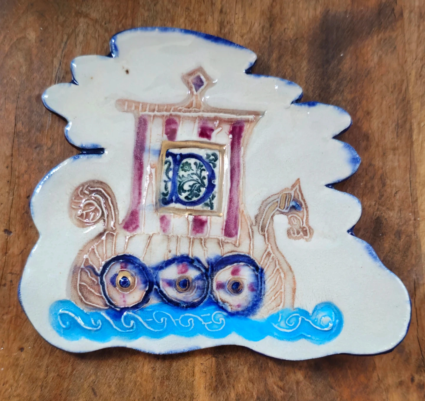 Decorative ceramic plaque featuring a Viking ship design with blue, purple, and brown accents. It has a wavy, cloud-like border. Perfect for adding a touch of historical charm to your home decor! A Heather Goldminc creation.
