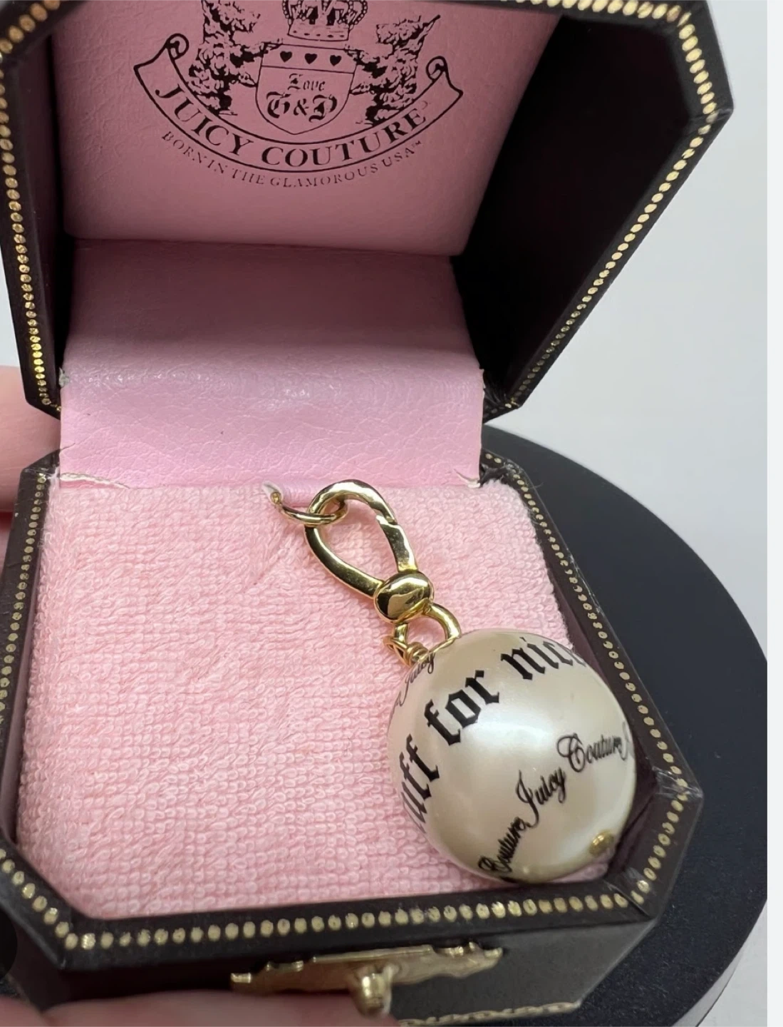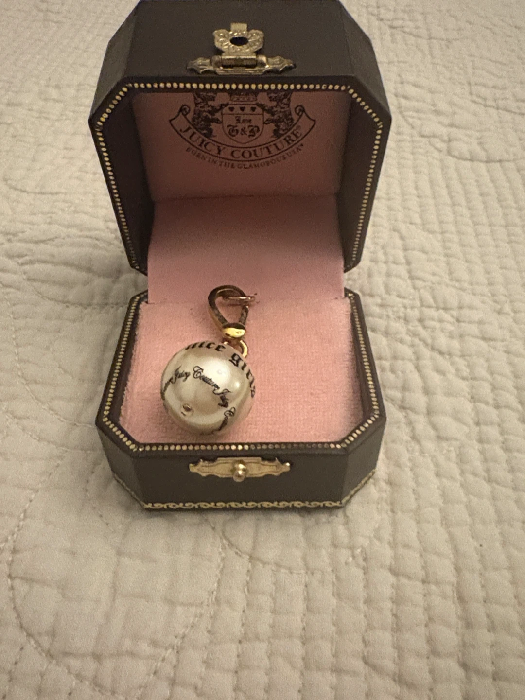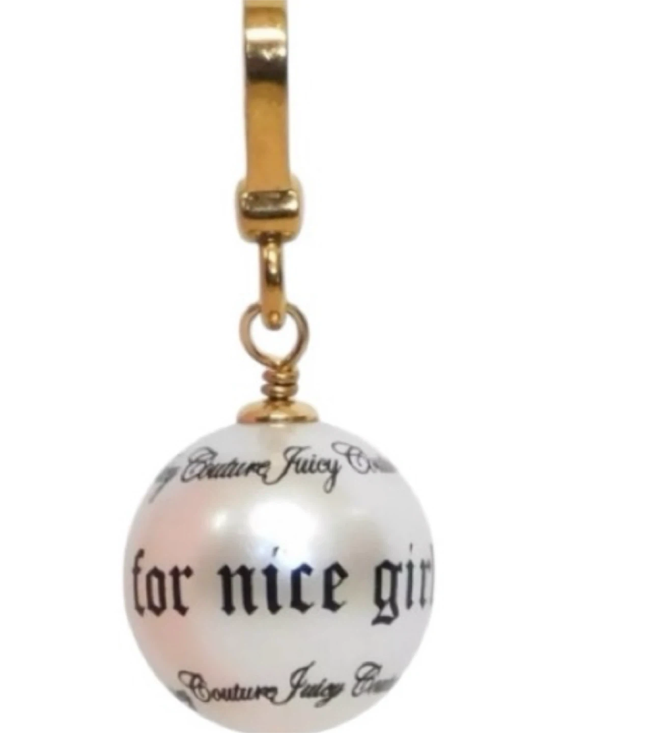 This is a Juicy Couture charm with the phrase "for nice girls" printed on it. It's a pearlized ball design. Comes in its original Juicy Couture box.