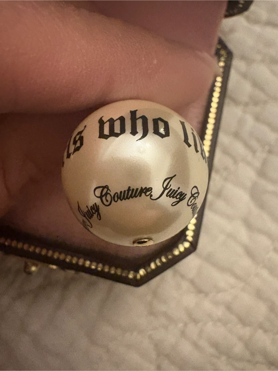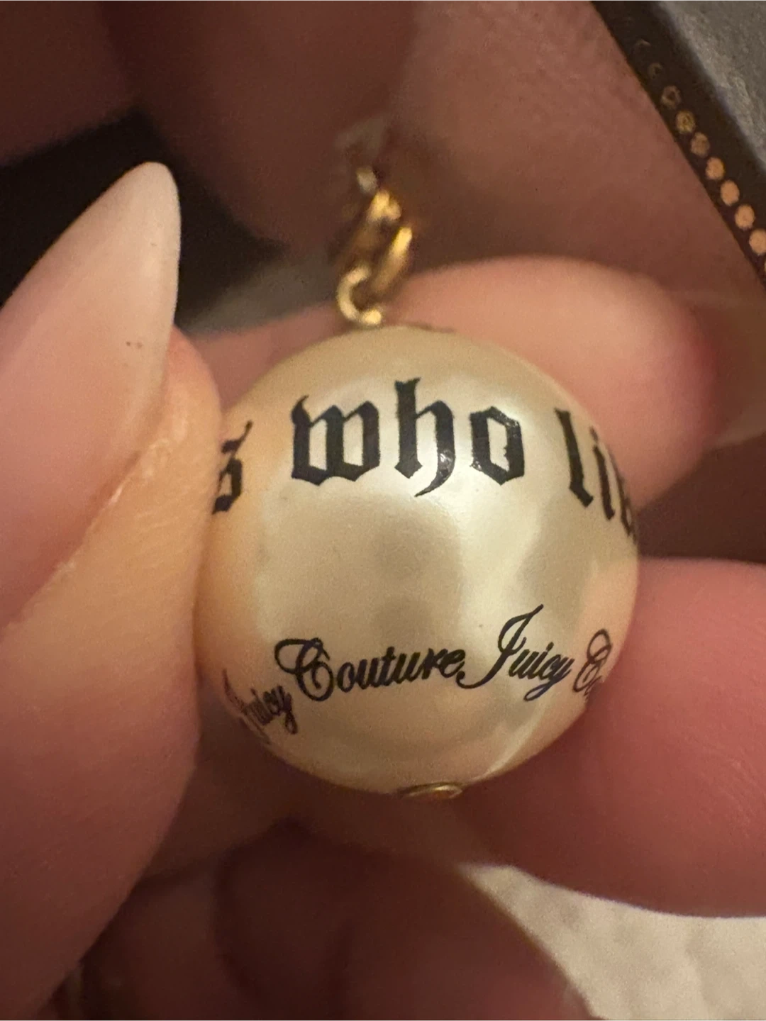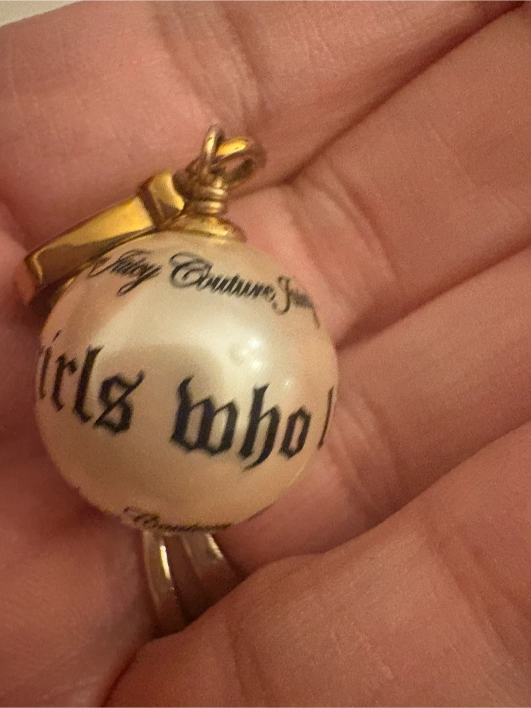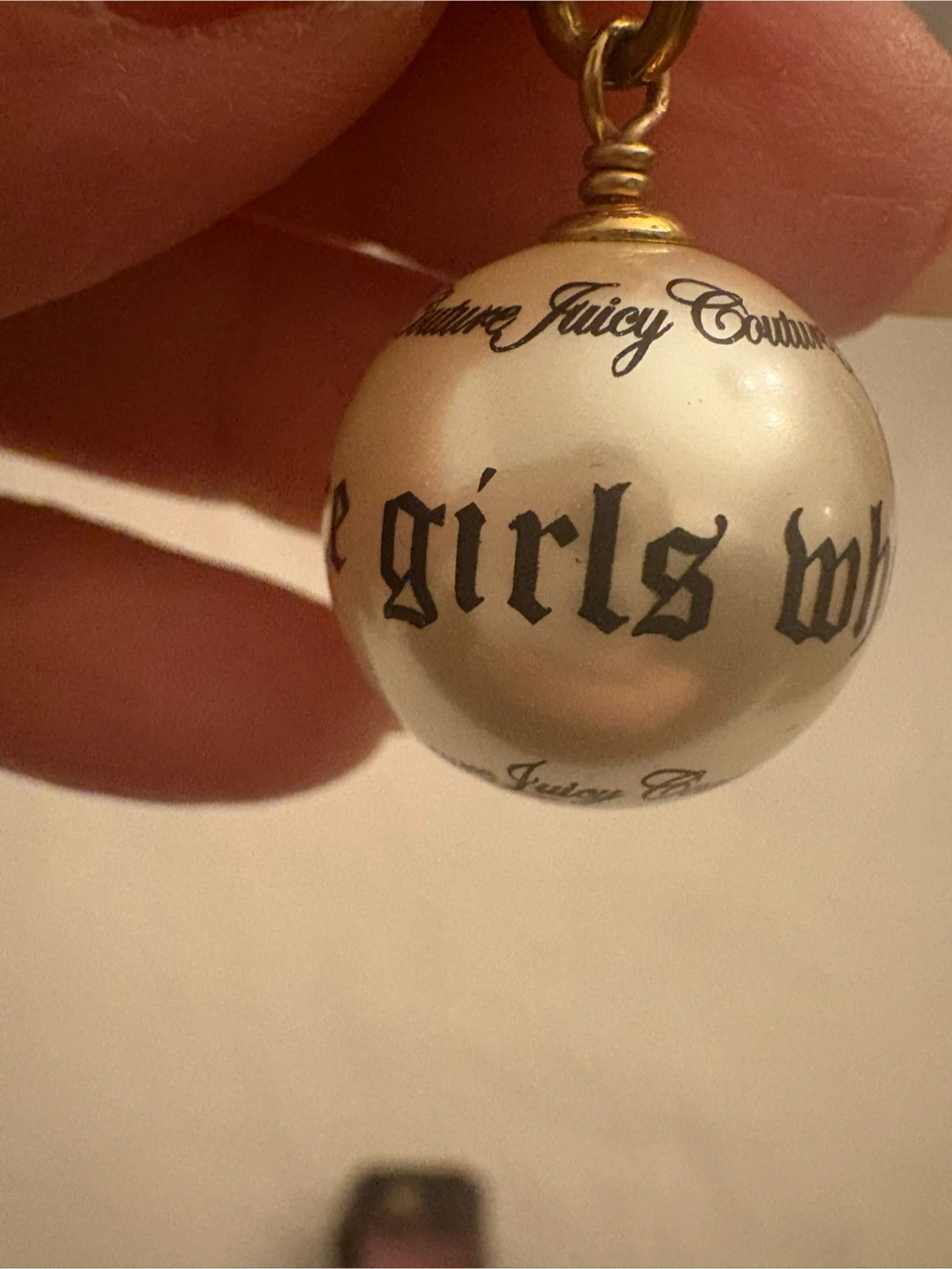 This is a Juicy Couture charm with the phrase "for nice girls" printed on it. It's a pearlized ball design. Comes in its original Juicy Couture box.