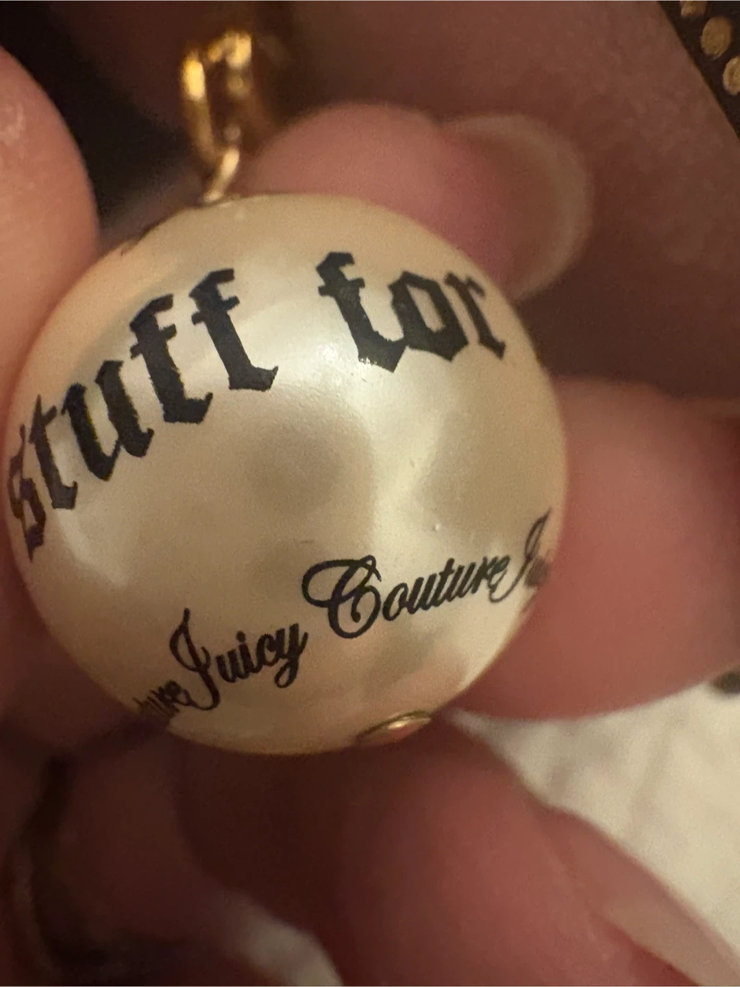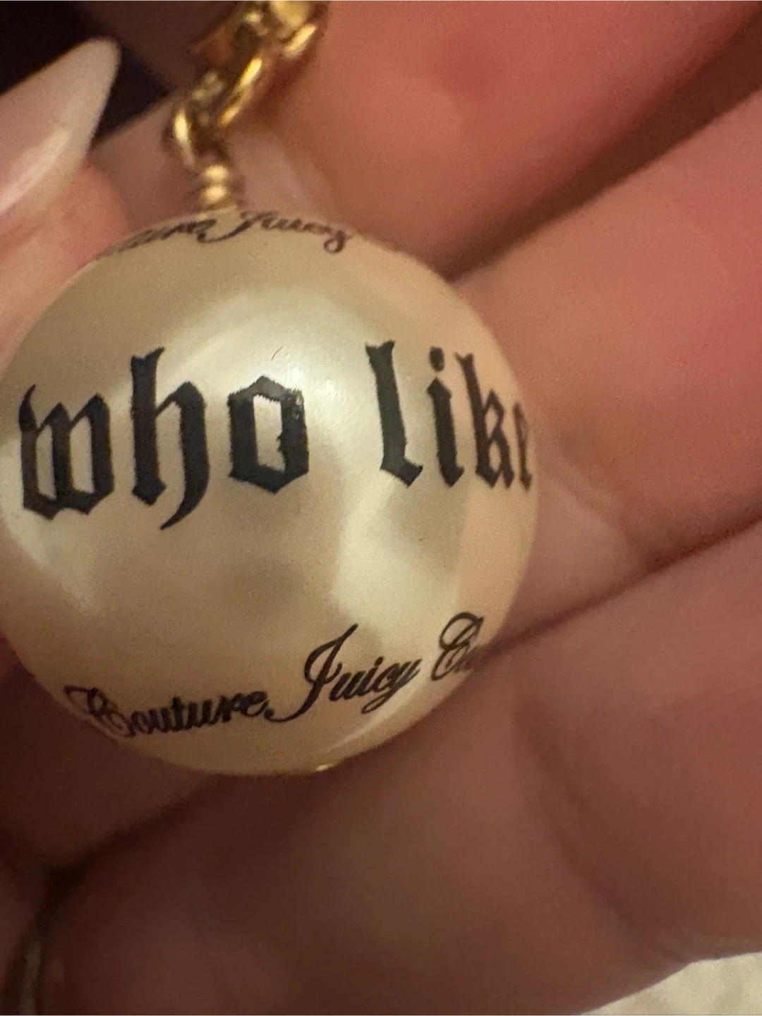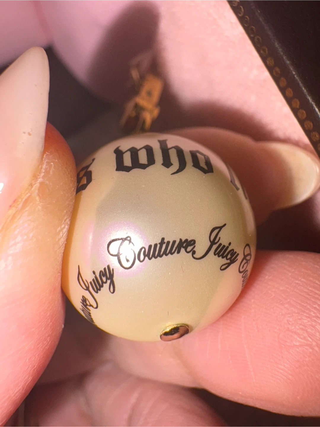 This is a Juicy Couture charm with the phrase "for nice girls" printed on it. It's a pearlized ball design. Comes in its original Juicy Couture box.