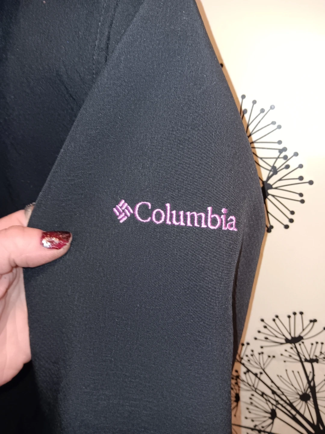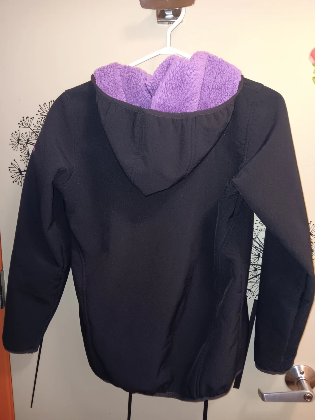 This Columbia hoodie is black with a bright purple fleece lining. It features a full zip front and a hood. Youth Size XL.