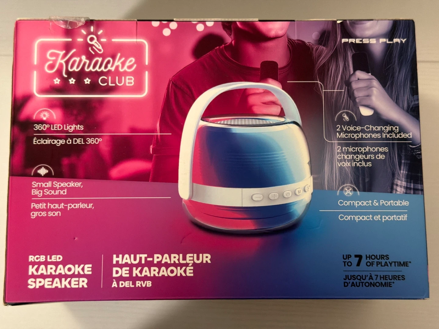 This Karaoke Club speaker features RGB LED lights and comes with two voice-changing microphones. It's compact and portable, offering up to 7 hours of playtime. Small speaker, big sound!