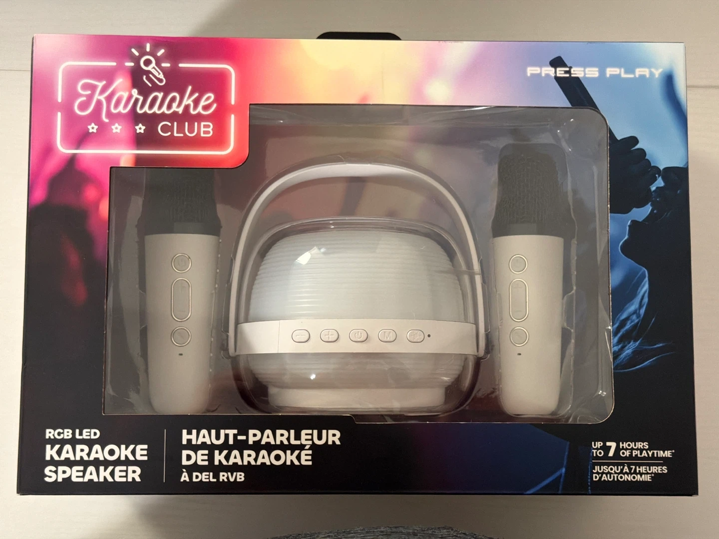 This Karaoke Club speaker features RGB LED lights and comes with two voice-changing microphones. It's compact and portable, offering up to 7 hours of playtime. Small speaker, big sound!