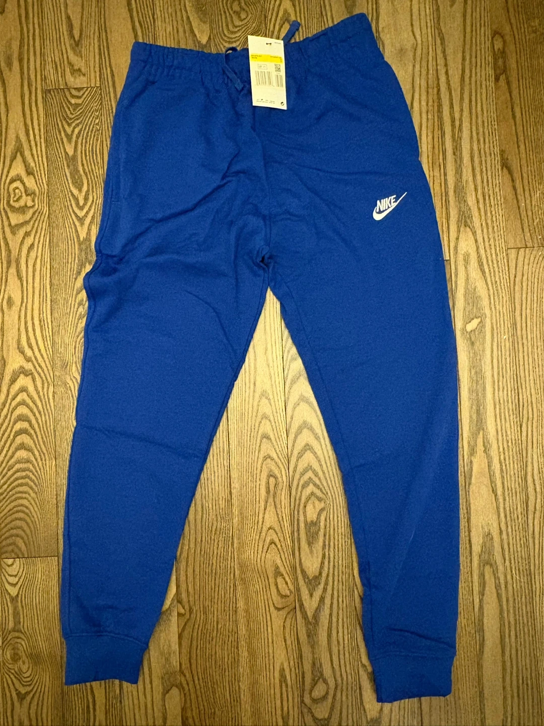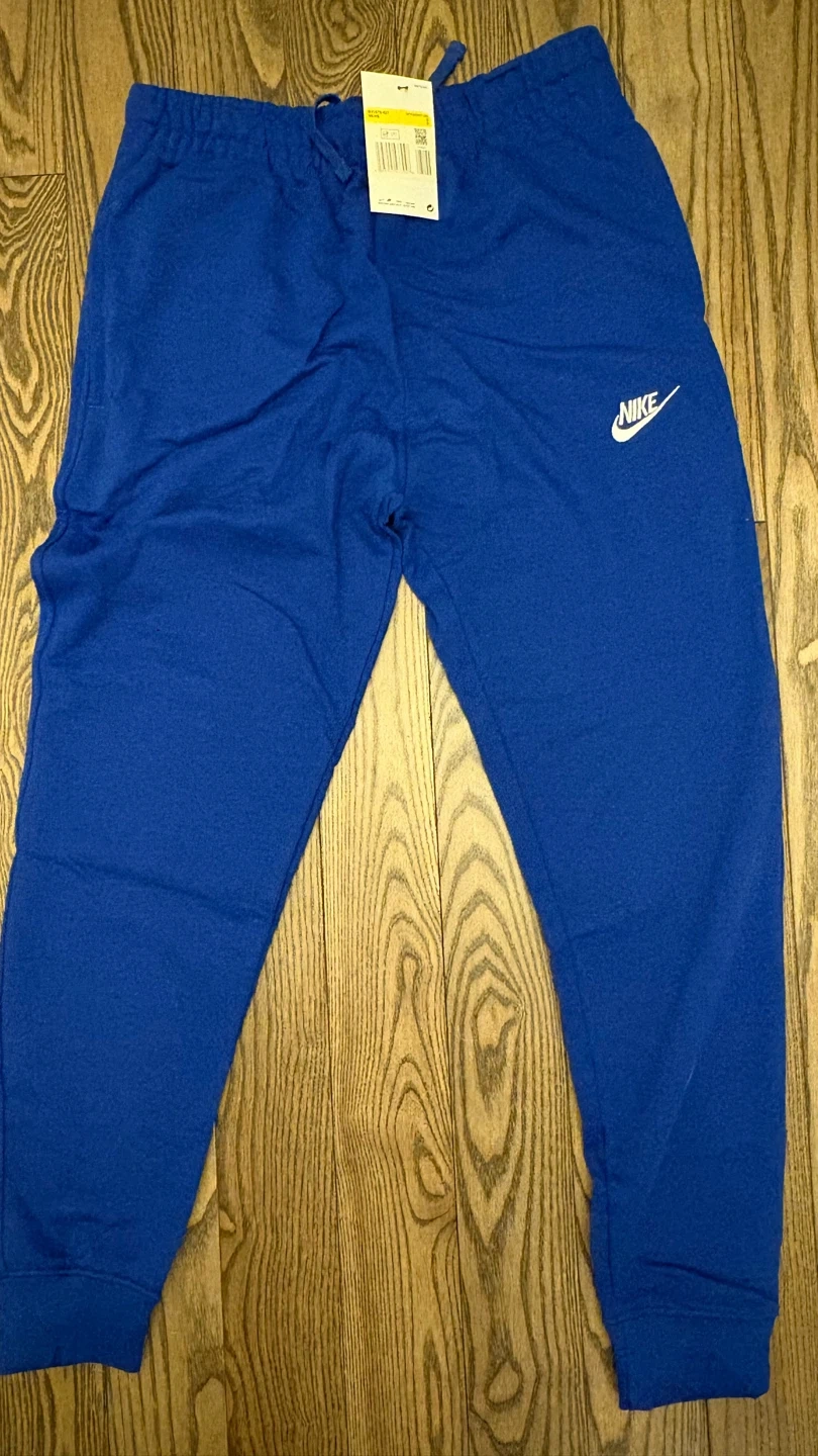 These are blue Nike jogger sweatpants. They're made of a soft cotton blend for comfort. Elastic waistband with drawstring. Ribbed cuffs.