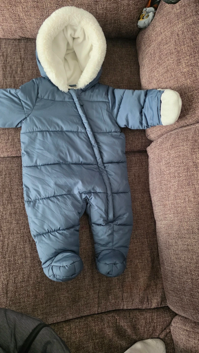 Blue puffer snowsuit from George. It's lined with soft white fleece for warmth. Features a cozy fur-lined hood and fold-over cuffs. Perfect for keeping your little one snug during colder weather!