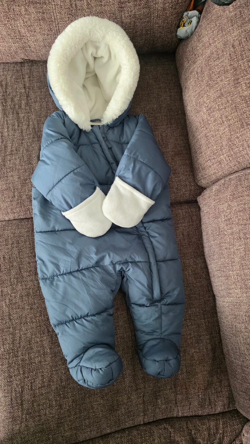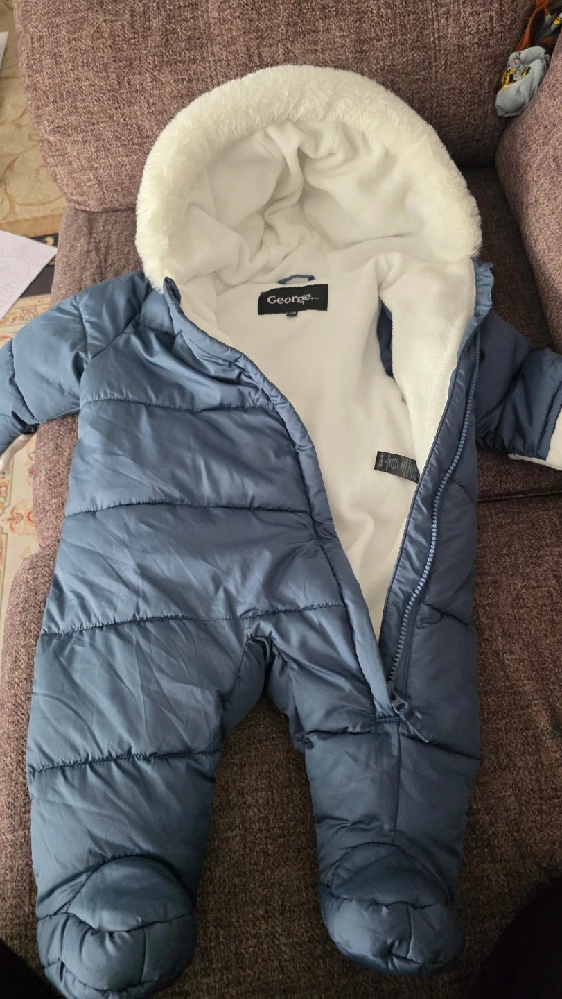 Blue puffer snowsuit from George. It's lined with soft white fleece for warmth. Features a cozy fur-lined hood and fold-over cuffs. Perfect for keeping your little one snug during colder weather!