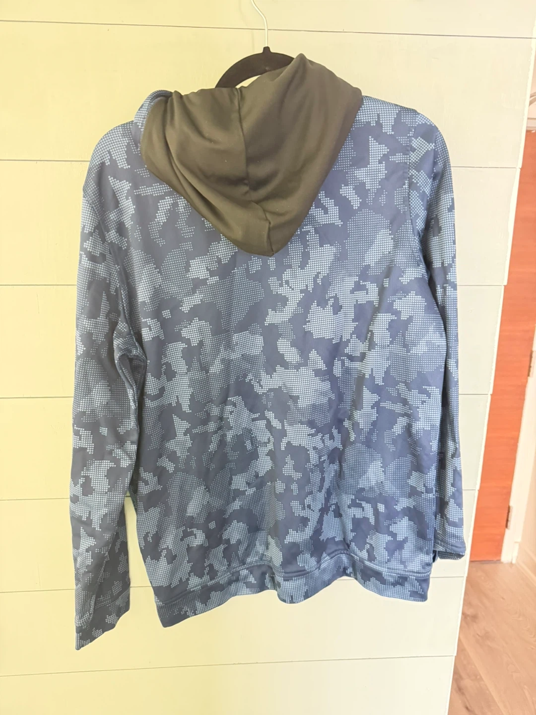 This Under Armour hoodie features a cool camouflage pattern. It has a comfortable hood and a front kangaroo pocket. Great for staying warm during outdoor activities!