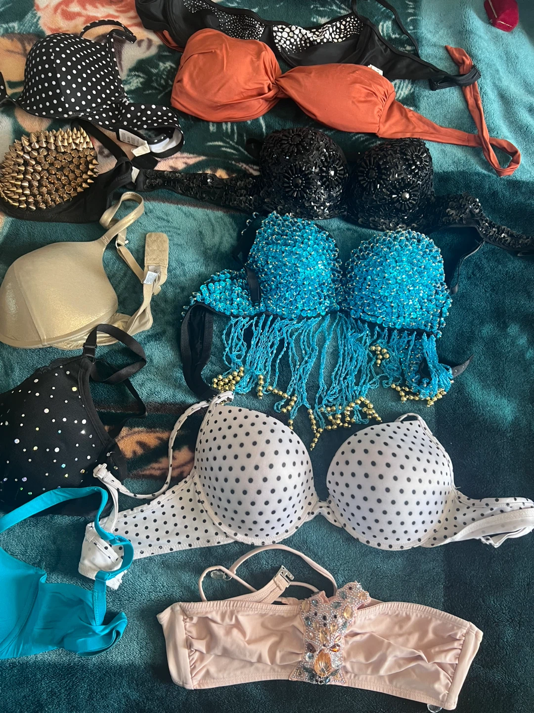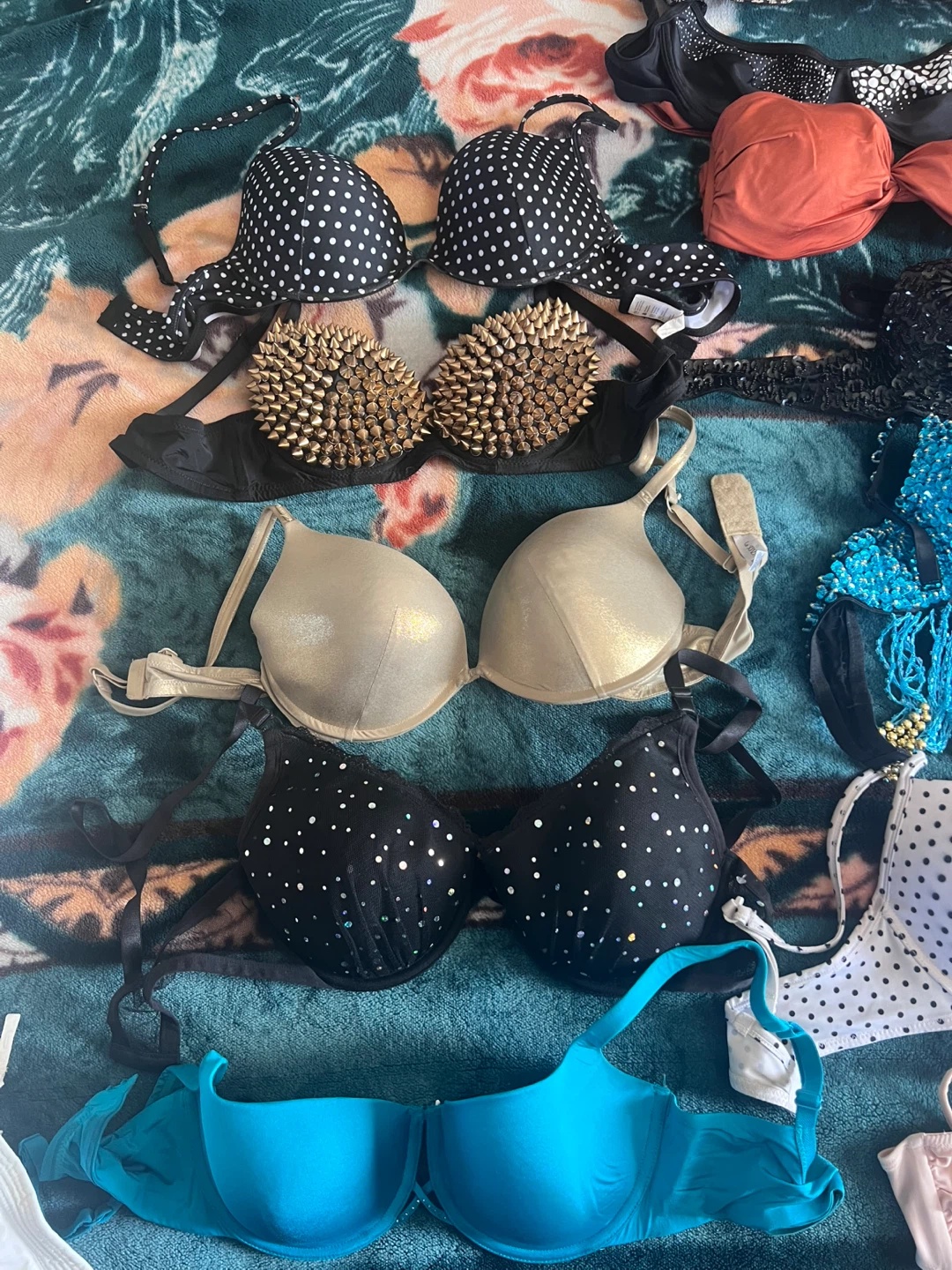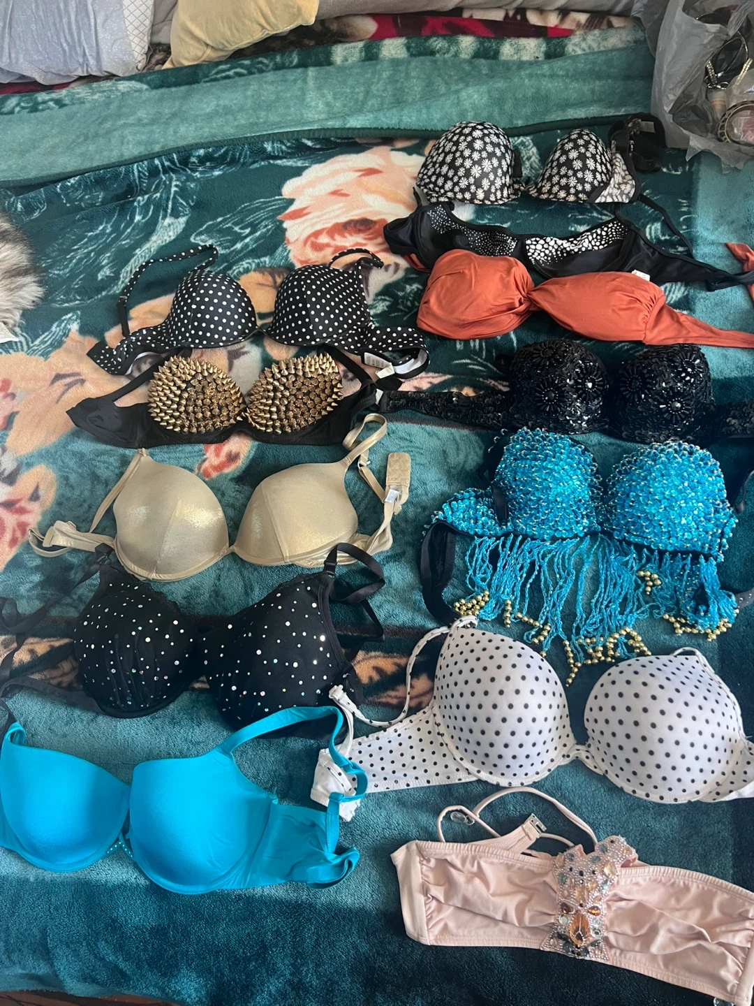 A collection of various women's bras in different styles and colours. Includes black, white polka dot, blue beaded, and metallic gold bras. Some bras feature unique embellishments like sequins and spikes. Straps are adjustable on most items. Let me now which one do you like and I can send you photos.
