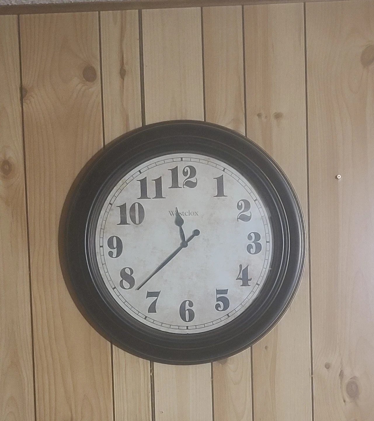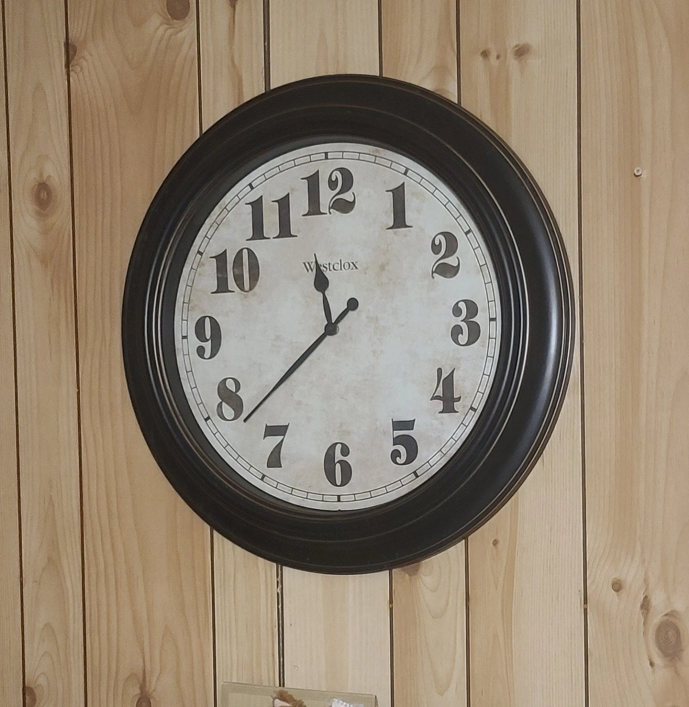 This is a Westclox wall clock. It has large, easy-to-read numbers and a dark frame. It's perfect for any room in your house!