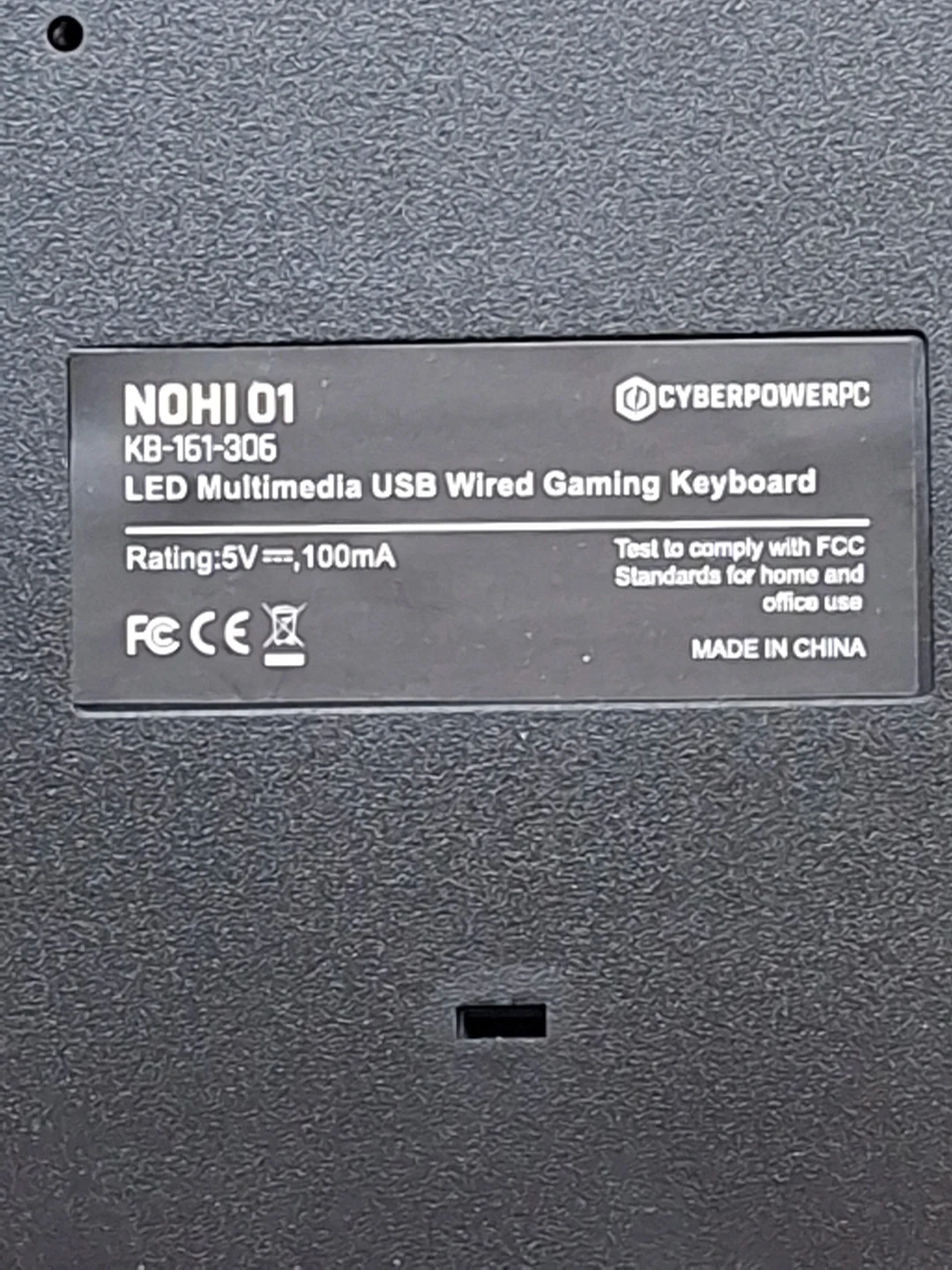 This CYBERPOWERPC NOHI 01 keyboard is a wired USB model with LED multimedia functionality. It's designed for gaming and features a standard QWERTY layout. Rating: 5V, 100mA. Made in China.