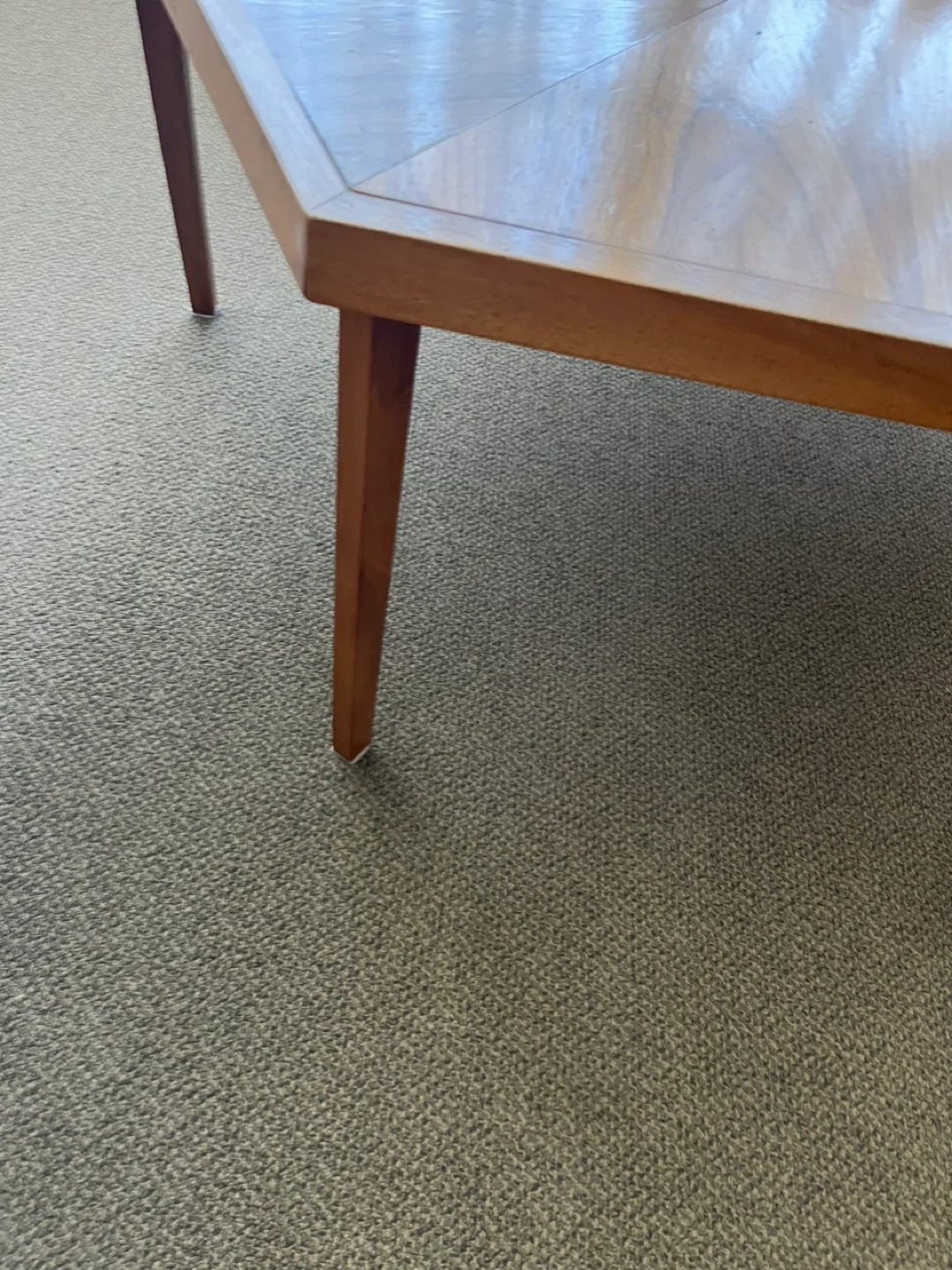 A stylish hexagonal coffee table with a beautiful walnut wood grain pattern. It's made with a light walnut wood finish and has six sturdy legs.