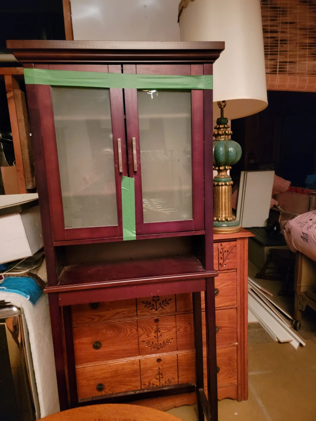 A deep red display cabinet with glass doors and shelving above a set of wooden drawers. It's a lovely piece for any room. The drawers are intricately carved with a floral motif.