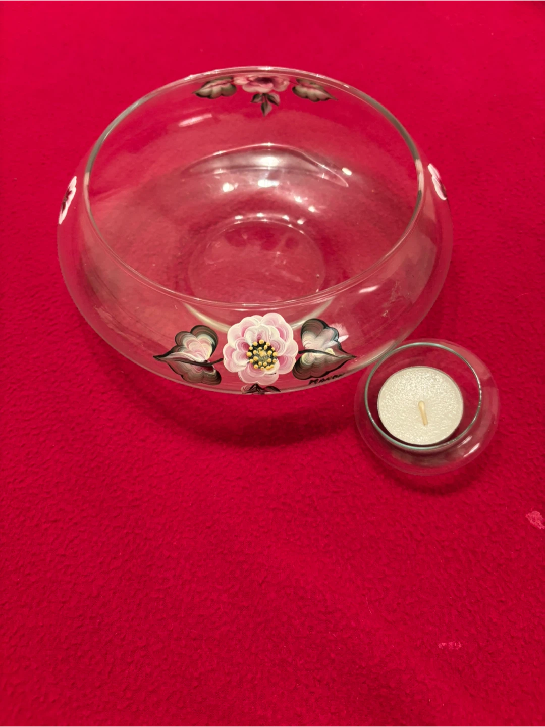 Selling a lovely glass bowl, hand-painted with a floral design. It comes with a small glass candle holder for floating candle. Perfect for adding a touch of charm to any room!
