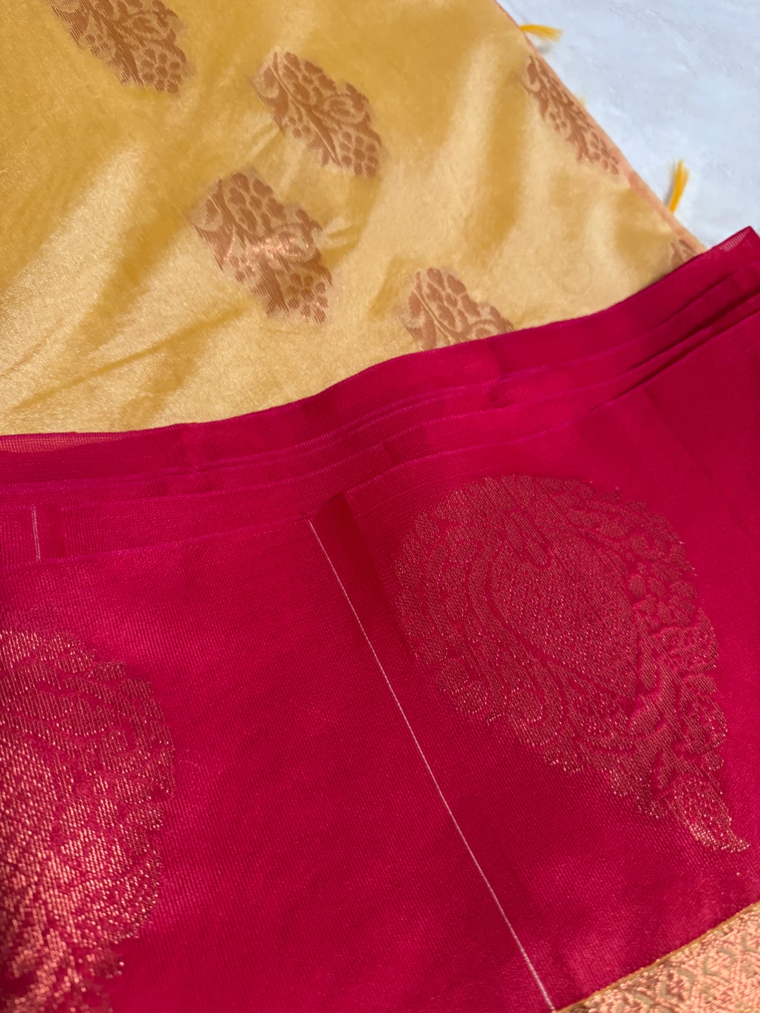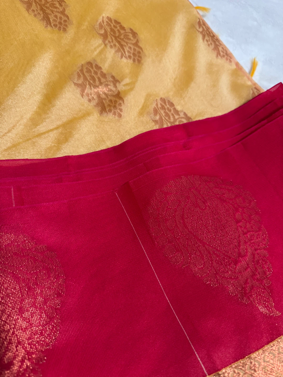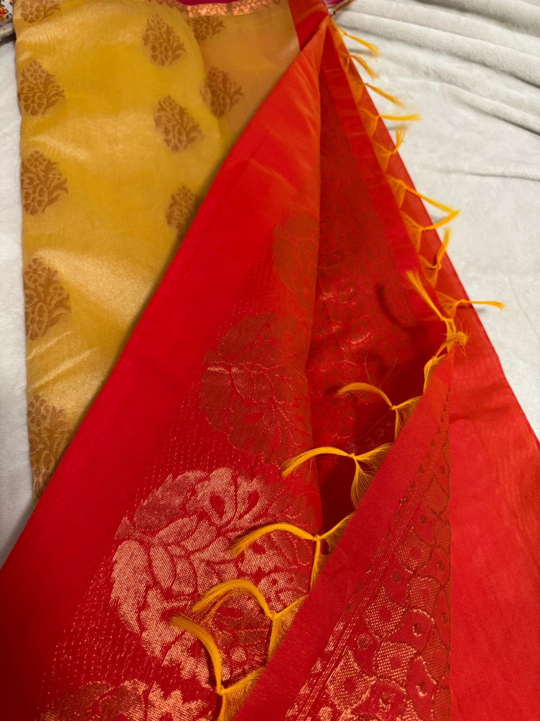 Beautiful sari with a red and gold colour scheme! The fabric has a lovely sheen and intricate patterns throughout. Perfect for a special occasion or cultural event