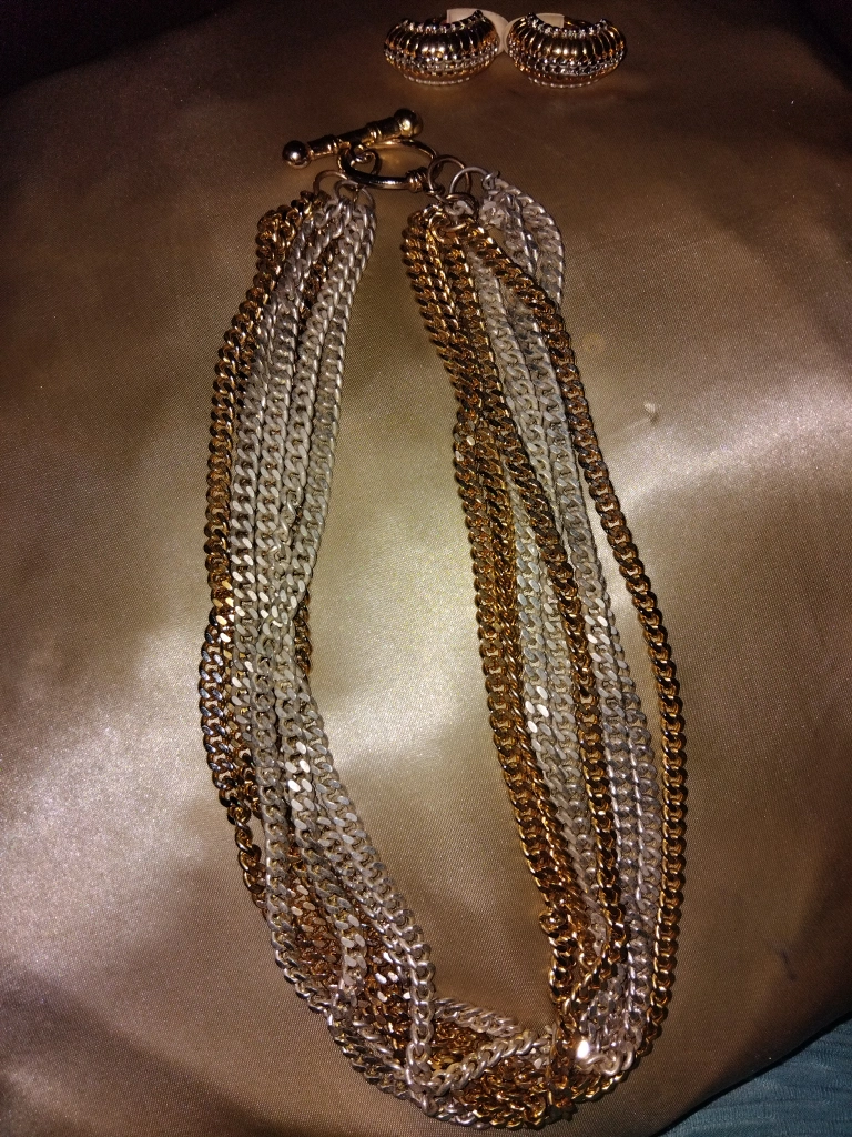 Selling a necklace and earrings set. The necklace is a multi-strand chain with both gold and silver-tone chains. The earrings are a matching gold tone