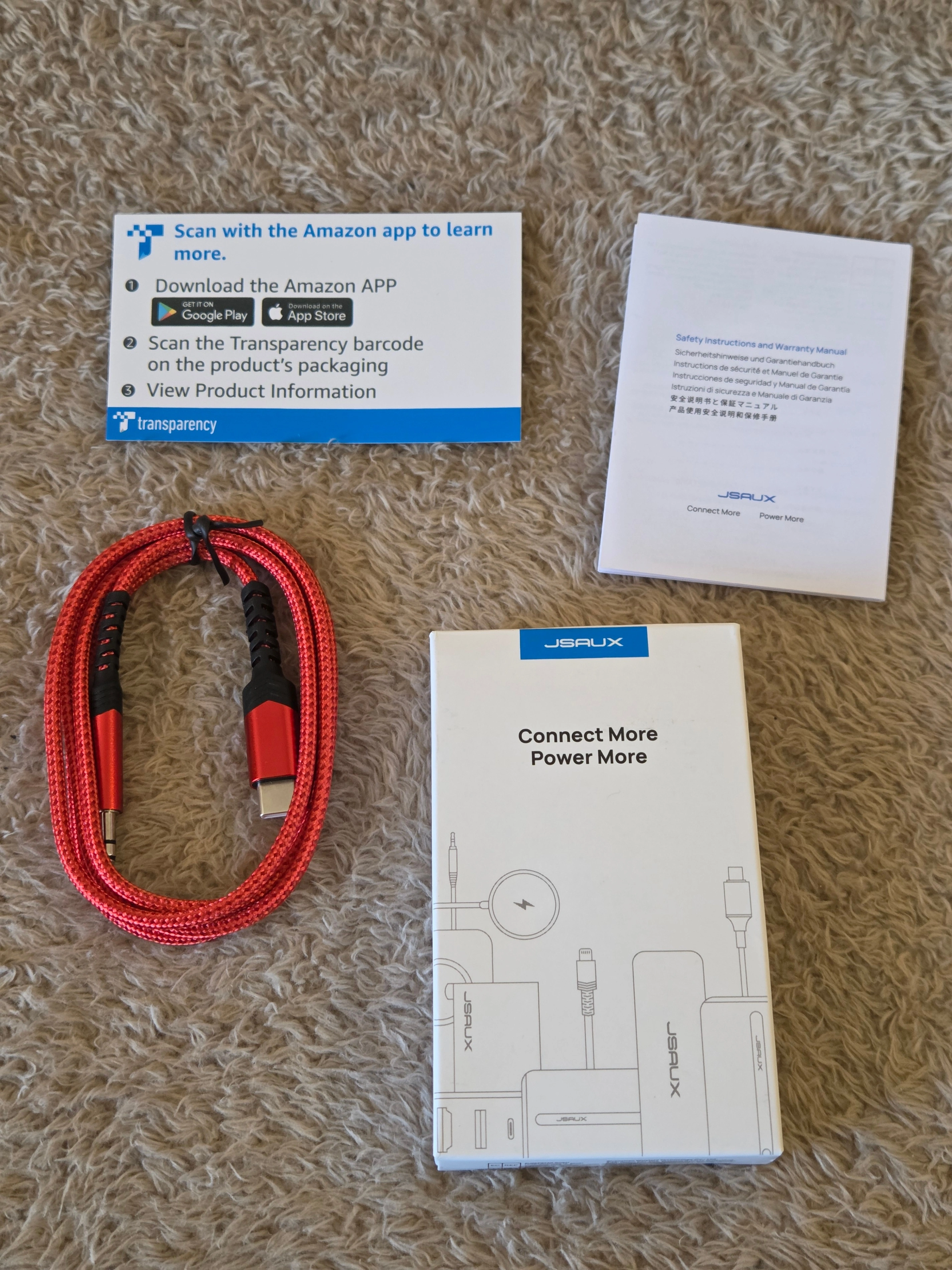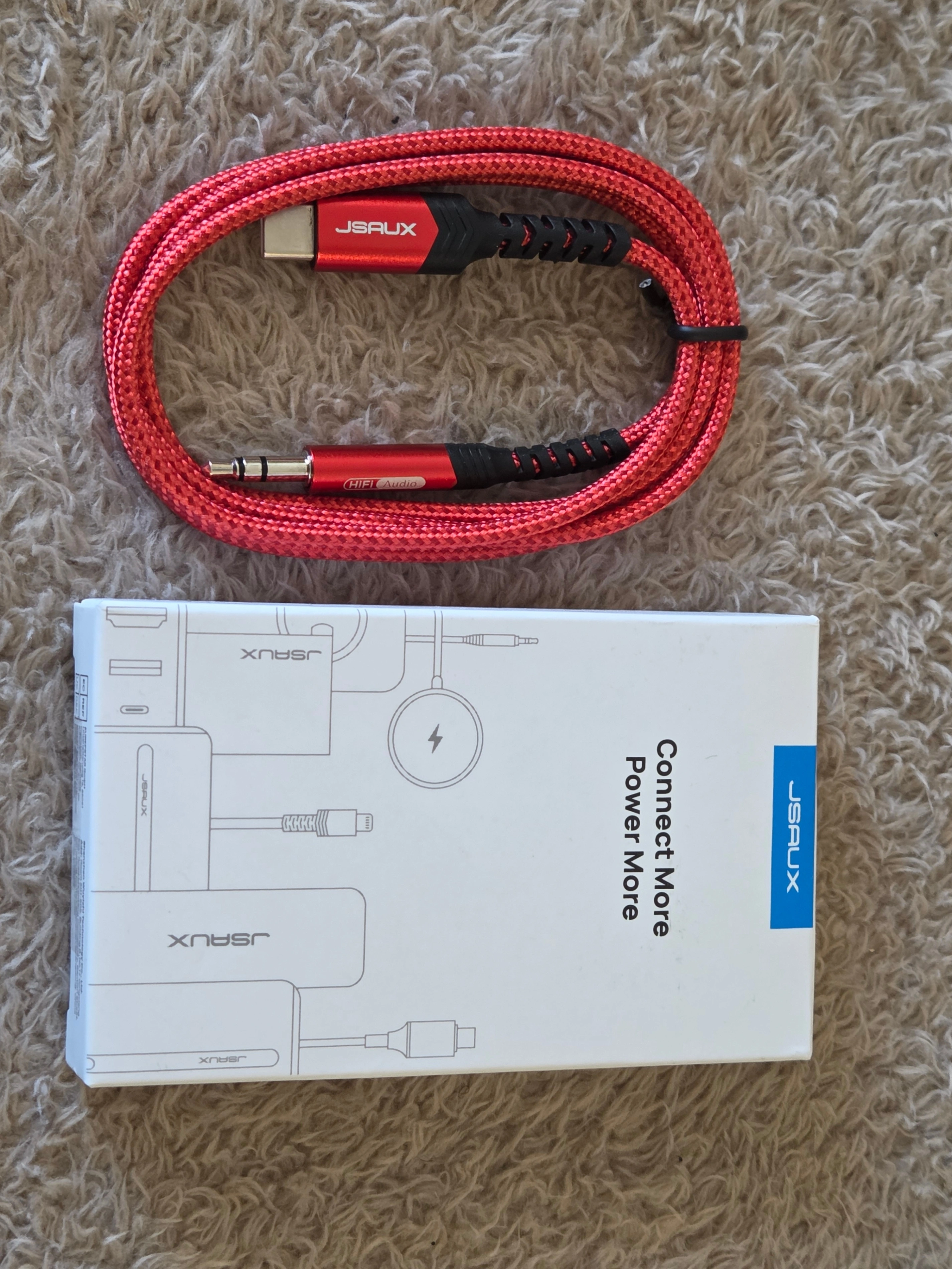 Handy USB-C to 3.5 mm aux cable from JSAUX in a durable red braided jacket – perfect to play music from a USB-C phone or tablet into a car AUX or home speakers. New/open box set with original packaging.