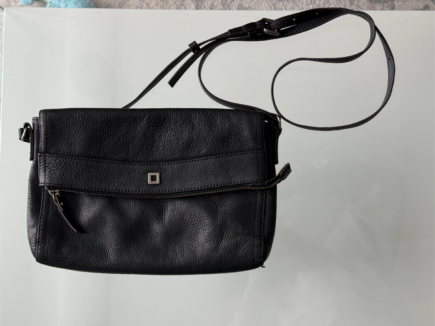 This Lodis crossbody bag is made of black leather. It features a zippered front pocket and a magnetic snap closure for the main compartment. Its adjustable strap makes it easy to wear.