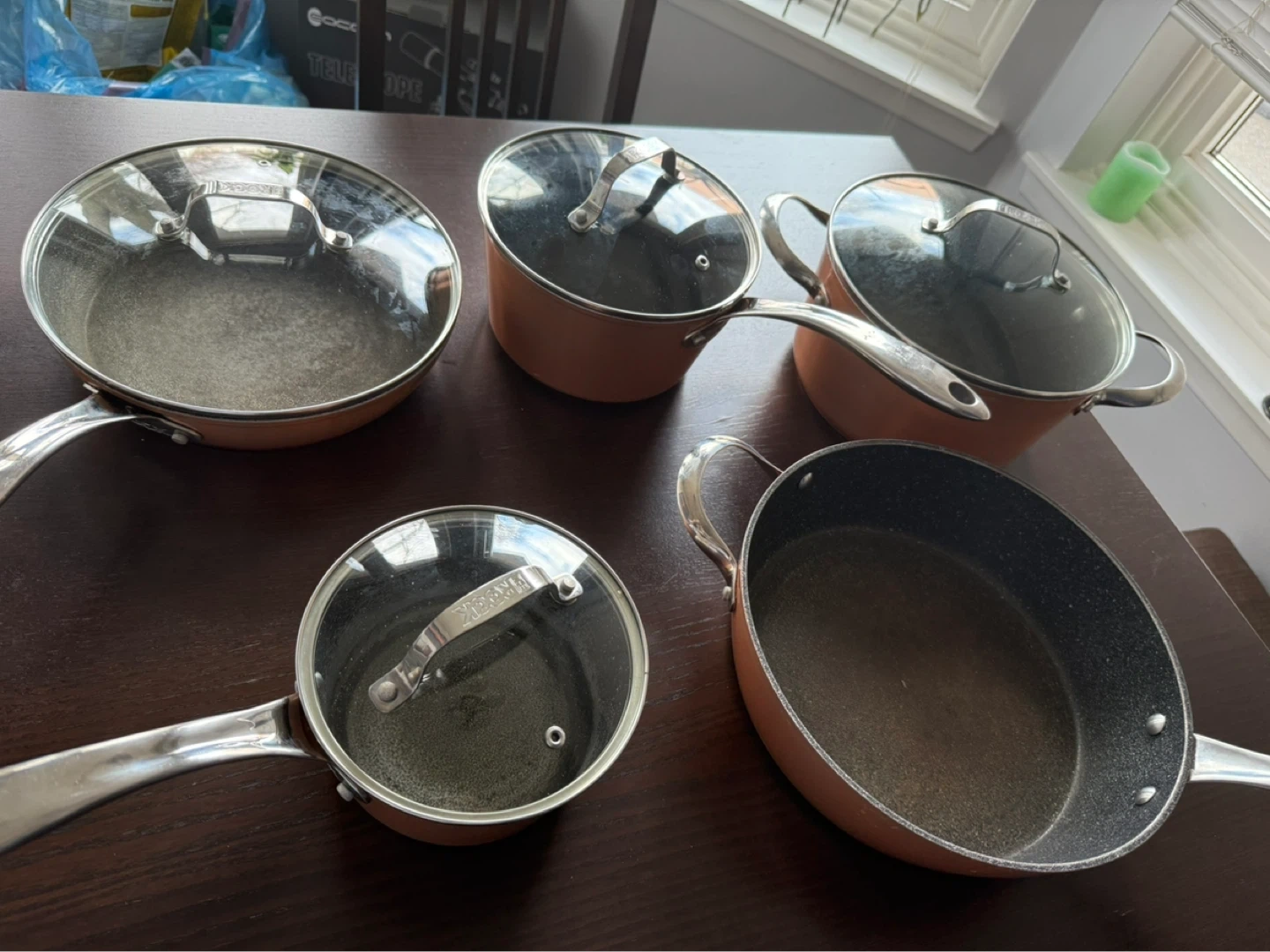 This is a set of copper-coloured pots and pans. They're all equipped with glass lids and have stainless steel handles. Includes multiple sizes for various cooking needs. Aluminum 9