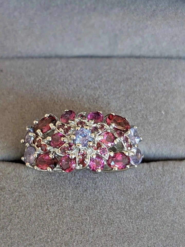 Make a statement with this beautifully crafted ring featuring natural rhodolite garnets and light purple tanzanite gemstones. Set in solid 925 sterling silver, the design evokes a floral burst of color, with deep raspberry-pink rhodolite stones encircling purple tanzanite accents. This piece blends bold elegance with timeless charm—perfect for collectors, gift-givers, or anyone who loves unique gemstone jewelry.