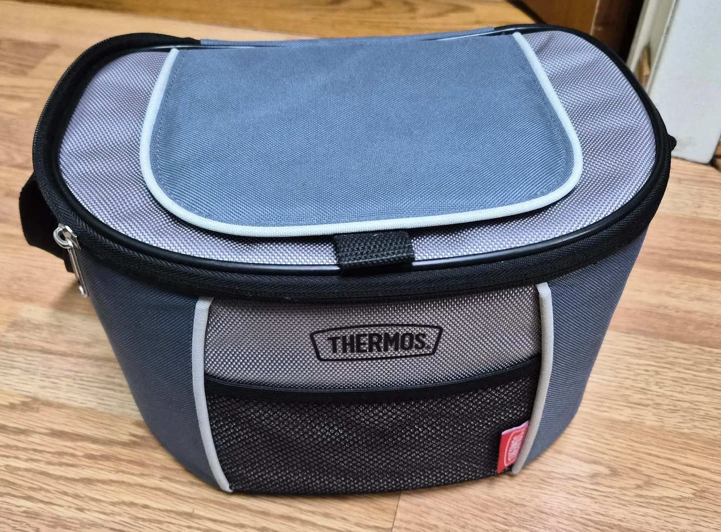 Thermos insulated lunch bag in grey and blue. It's perfect for keeping your food and drinks cool on the go. Zipper closure and a durable exterior.