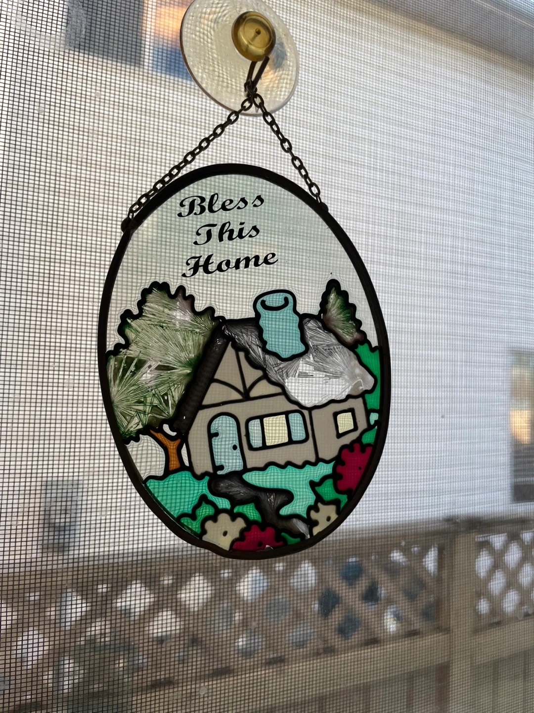 Three decorative stained glass suncatchers. One features a hummingbird with flowers, another a tropical scene with palm trees and orchids, and the third has 'Bless This Home' with a house illustration. They all come with a hanging chain. These pieces add a lovely touch to any window!