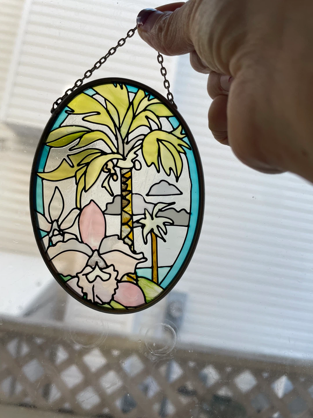 Three decorative stained glass suncatchers. One features a hummingbird with flowers, another a tropical scene with palm trees and orchids, and the third has 'Bless This Home' with a house illustration. They all come with a hanging chain. These pieces add a lovely touch to any window!
