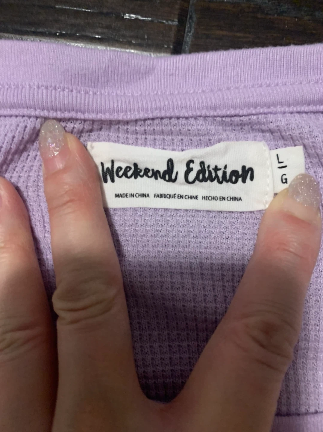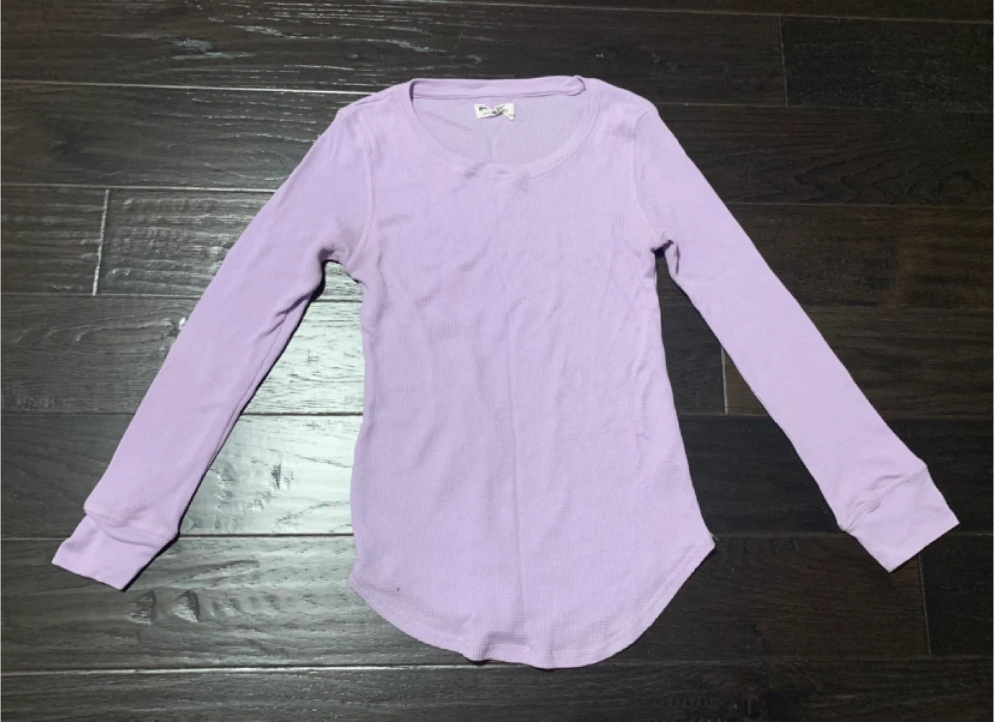 A long-sleeved top from Weekend Edition in a light lavender colour. It's a waffle-knit thermal style.