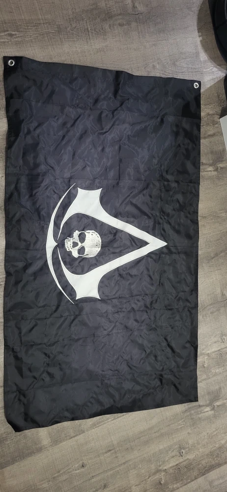 This is a black flag featuring a white design that includes a skull. It's made of nylon material and has grommets for hanging. Could use a light wash otherwise like brand new.