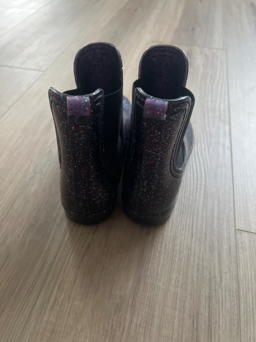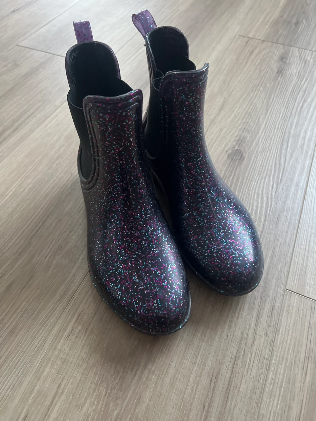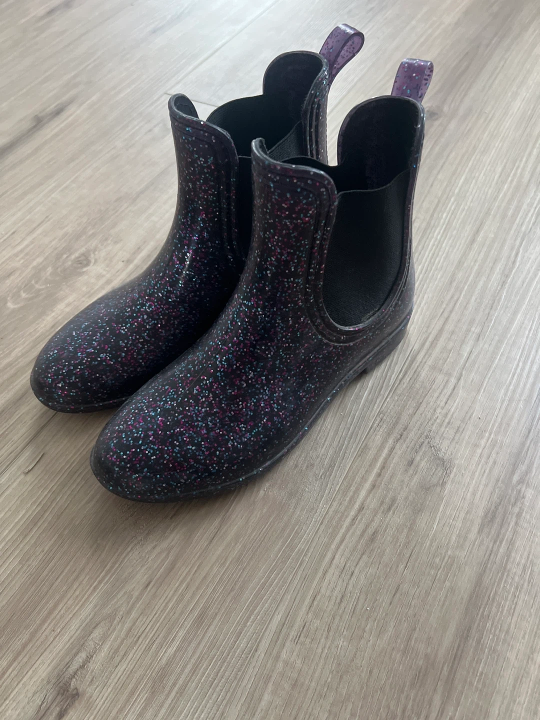 Cute black rain boots with glitter accents. These ankle boots feature elastic side panels for easy on and off. Perfect for keeping little feet dry on rainy days! Size 2