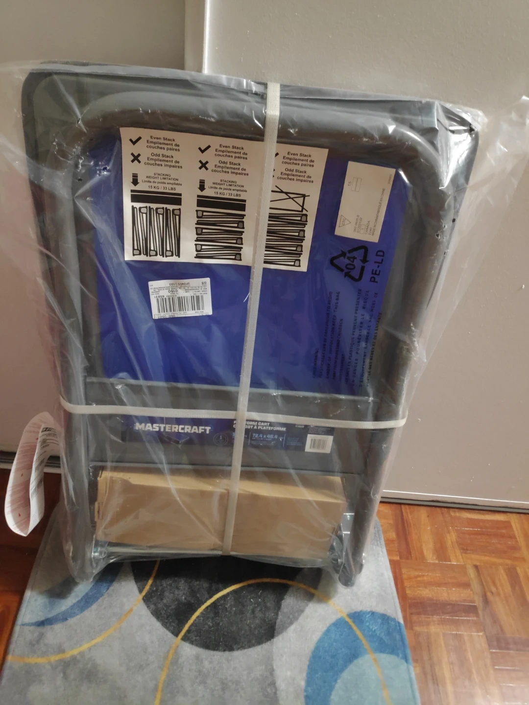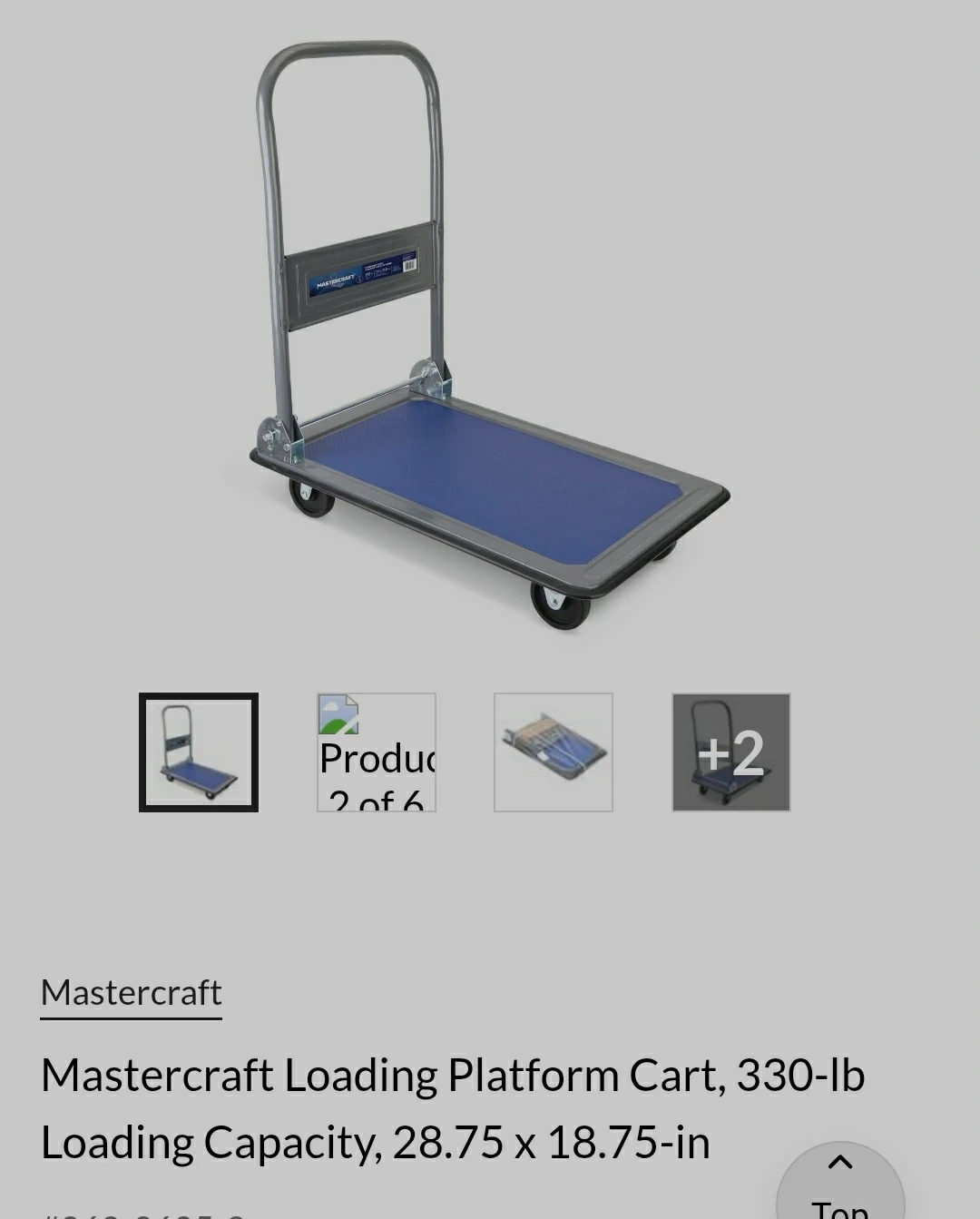 This Mastercraft loading platform cart has a 330-lb capacity. It's 28.75 x 18.75 inches. Perfect for moving heavy items around your garage or workshop!