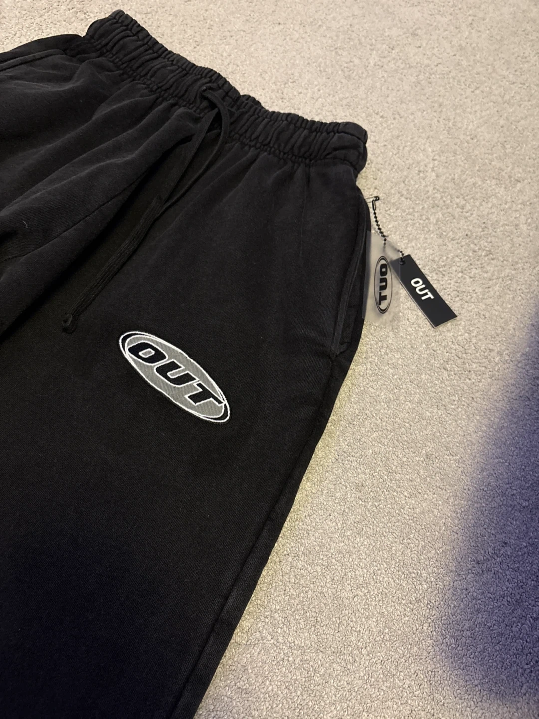 These black OUT sweatpants come in a size small. They feature an elastic waistband with a drawstring and a back pocket. The fabric is soft and comfortable, perfect for casual wear.