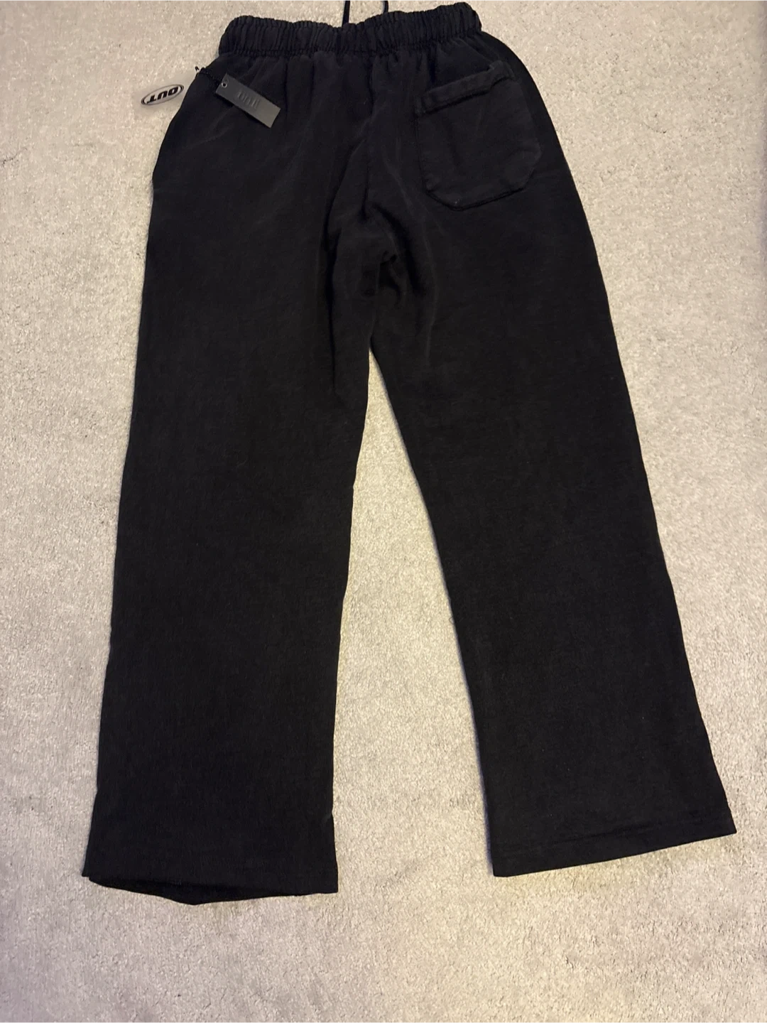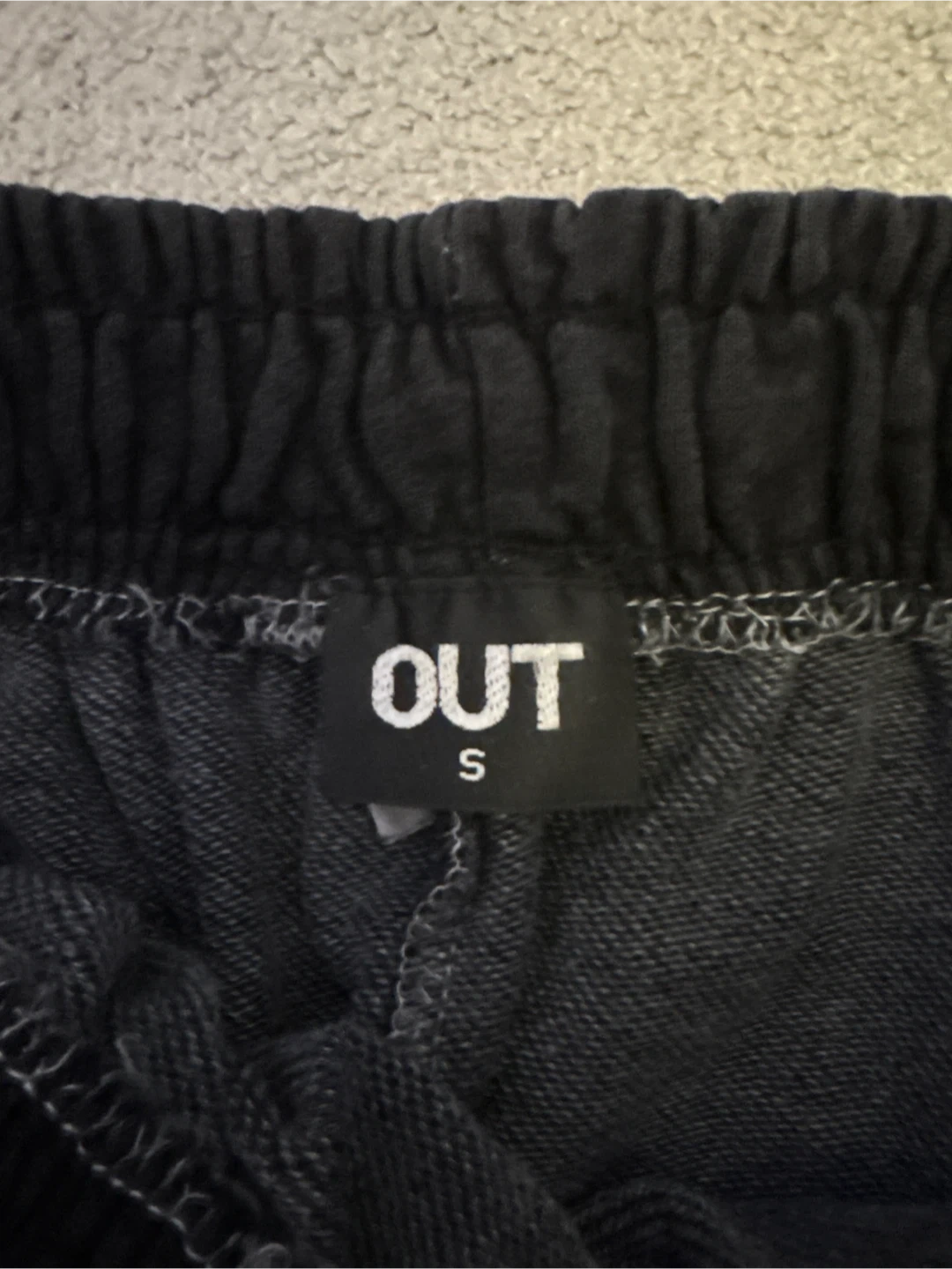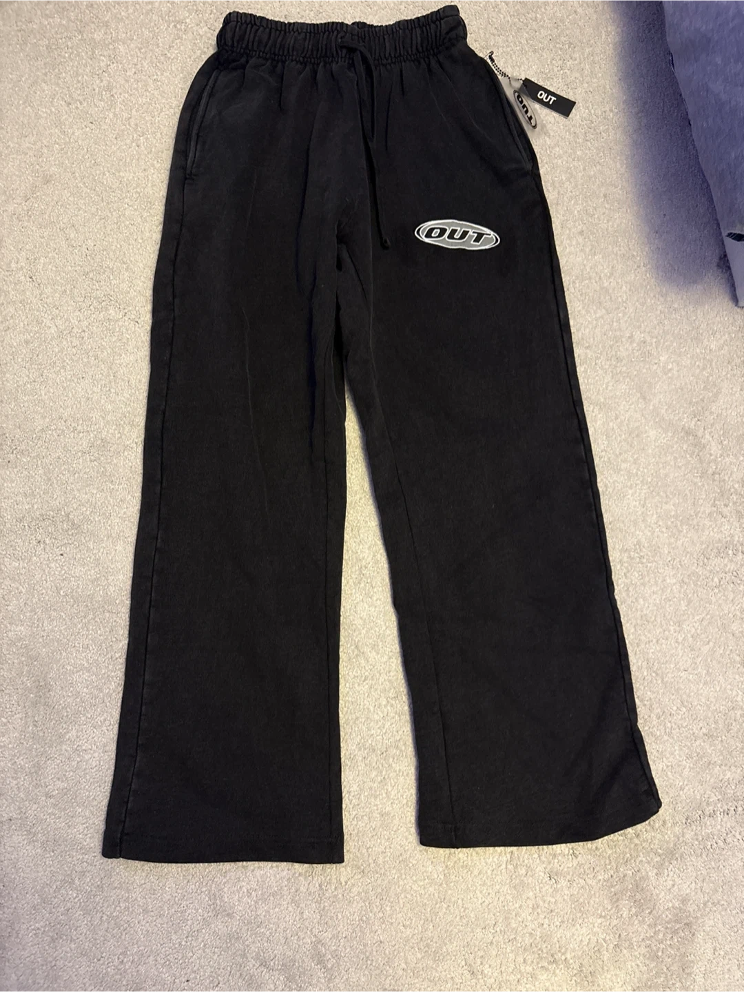 These black OUT sweatpants come in a size small. They feature an elastic waistband with a drawstring and a back pocket. The fabric is soft and comfortable, perfect for casual wear.