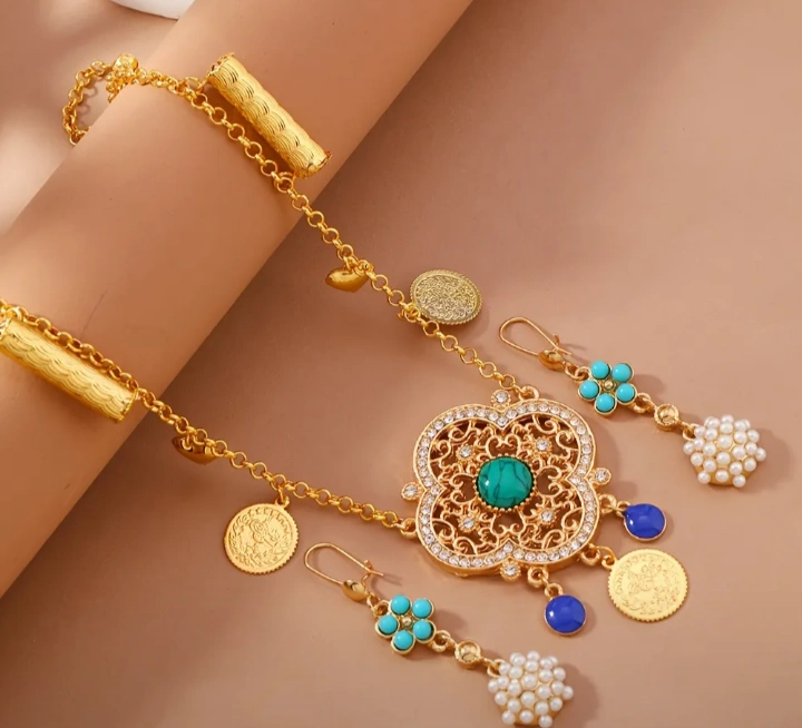 Never worn,, Gorgeous gold-tone necklace and earring set! The necklace features a detailed flower pendant with a turquoise centre stone, gold coins, and blue beads. The matching earrings complement the necklace perfectly, making it a stunning addition to any outfit