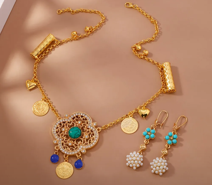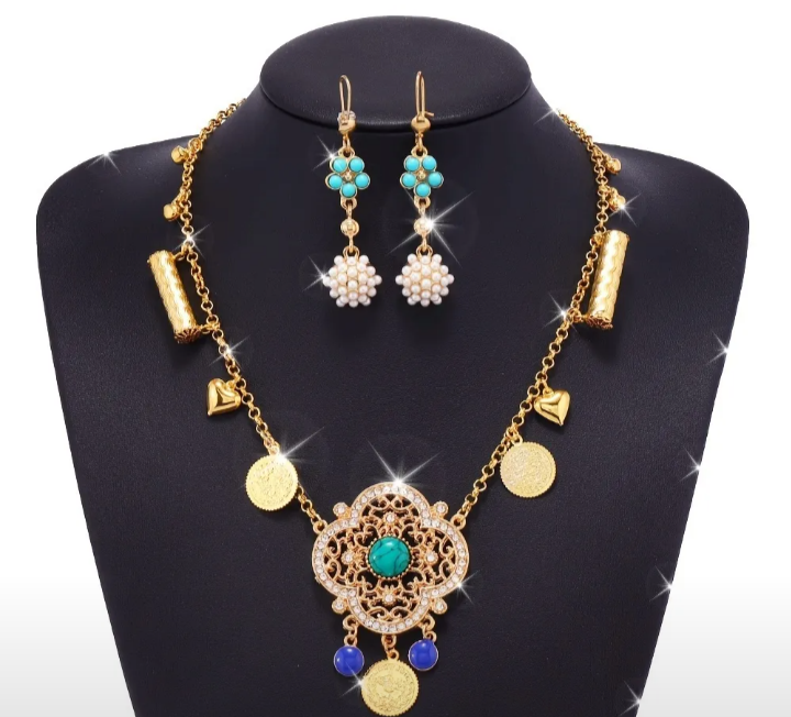 Never worn,, Gorgeous gold-tone necklace and earring set! The necklace features a detailed flower pendant with a turquoise centre stone, gold coins, and blue beads. The matching earrings complement the necklace perfectly, making it a stunning addition to any outfit