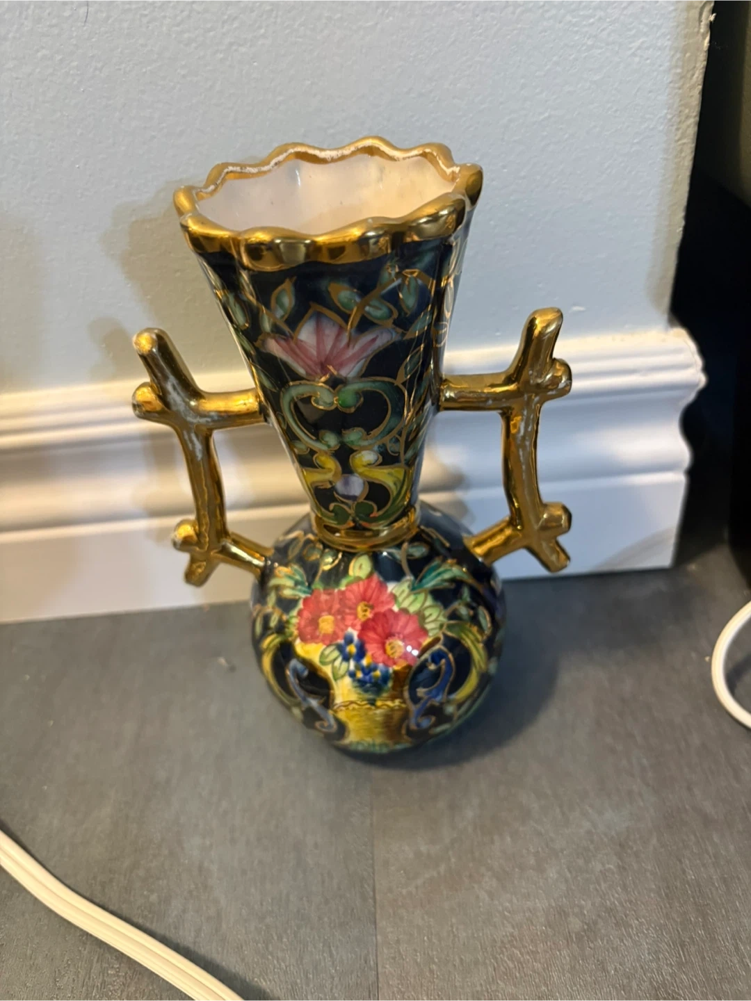This is a decorative vase with a black base and gold accents. It features a floral design with vibrant colours. The vase has two small handles and a fluted opening. It's perfect for adding a touch of elegance to any room.