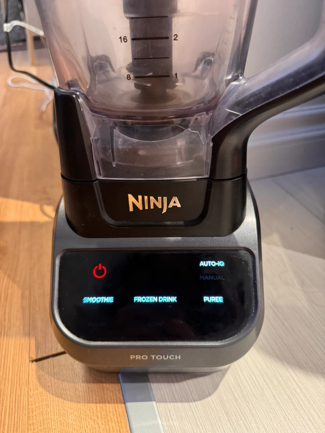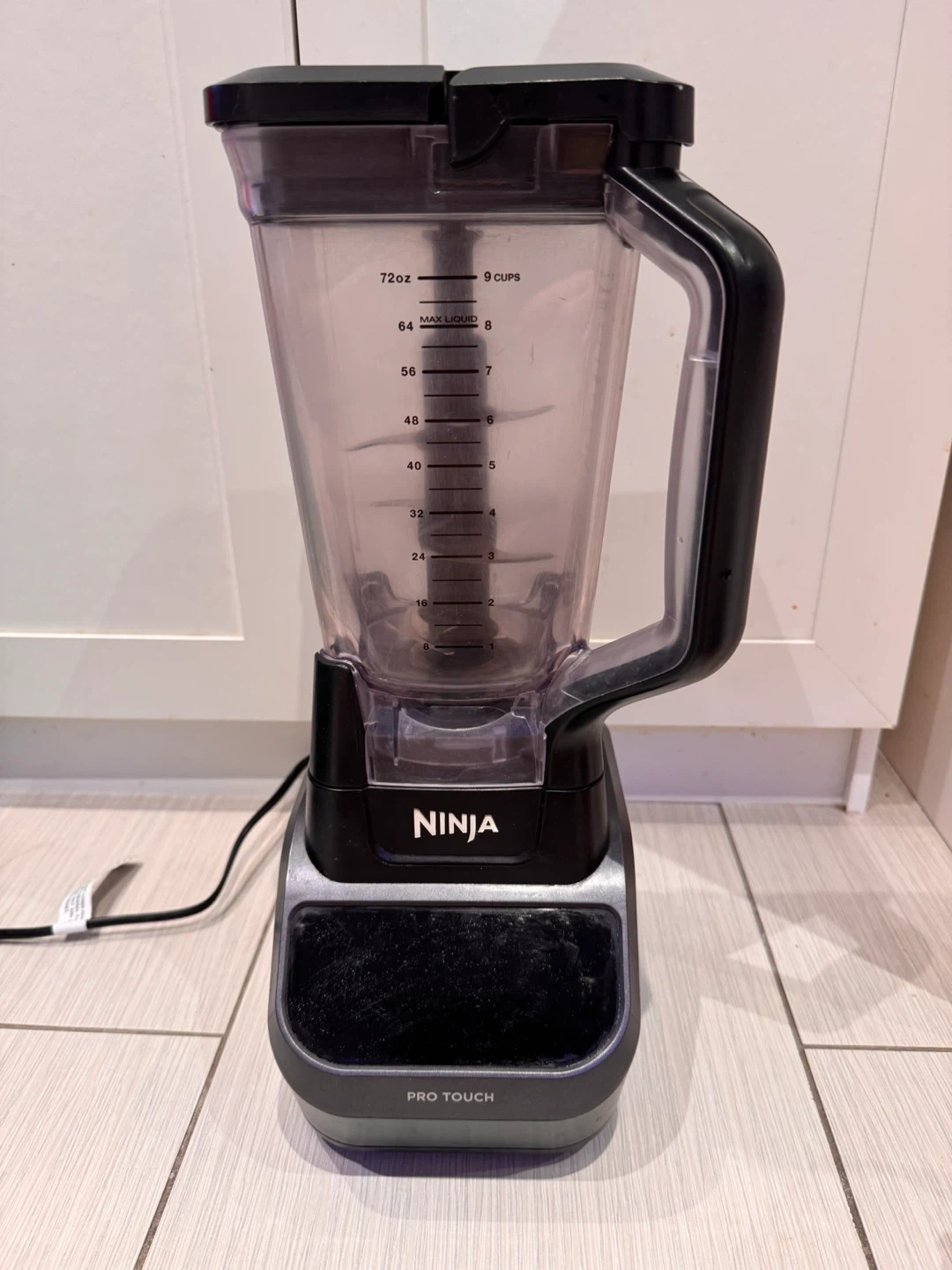 Ninja blender with Auto-IQ and pre-set programs for smoothies, frozen drinks, and purees. Features "Pro Touch" controls. It has a 72 oz cup capacity. Everything is in good condition (powerful grinding) but the pitcher shows some signs of wear as it’s shown in the picture.