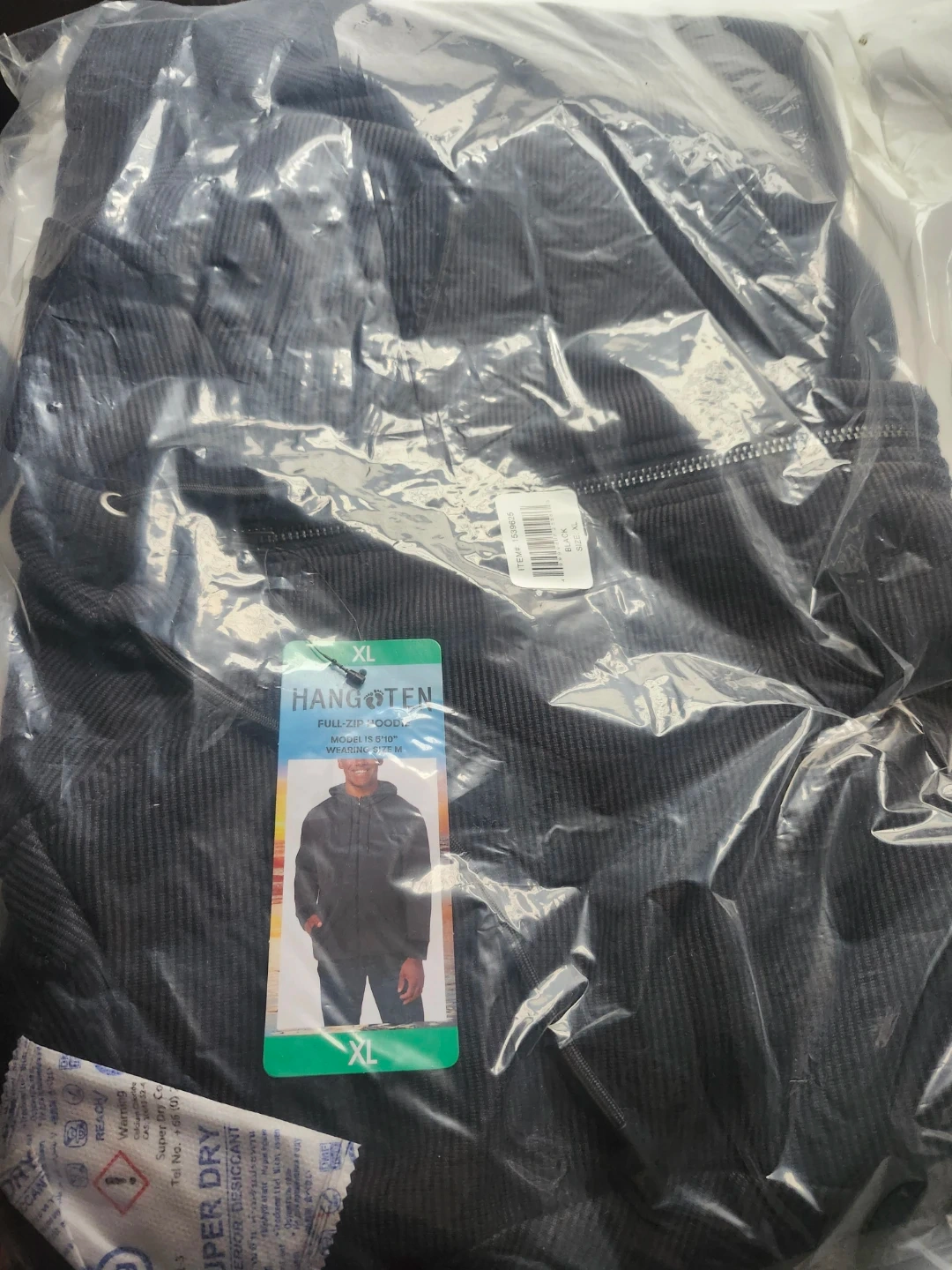 This is a Hang Ten full-zip hoodie in black. It's a size XL. The material is corduroy. It comes with a hood. This hoodie is great for staying warm on cooler days!