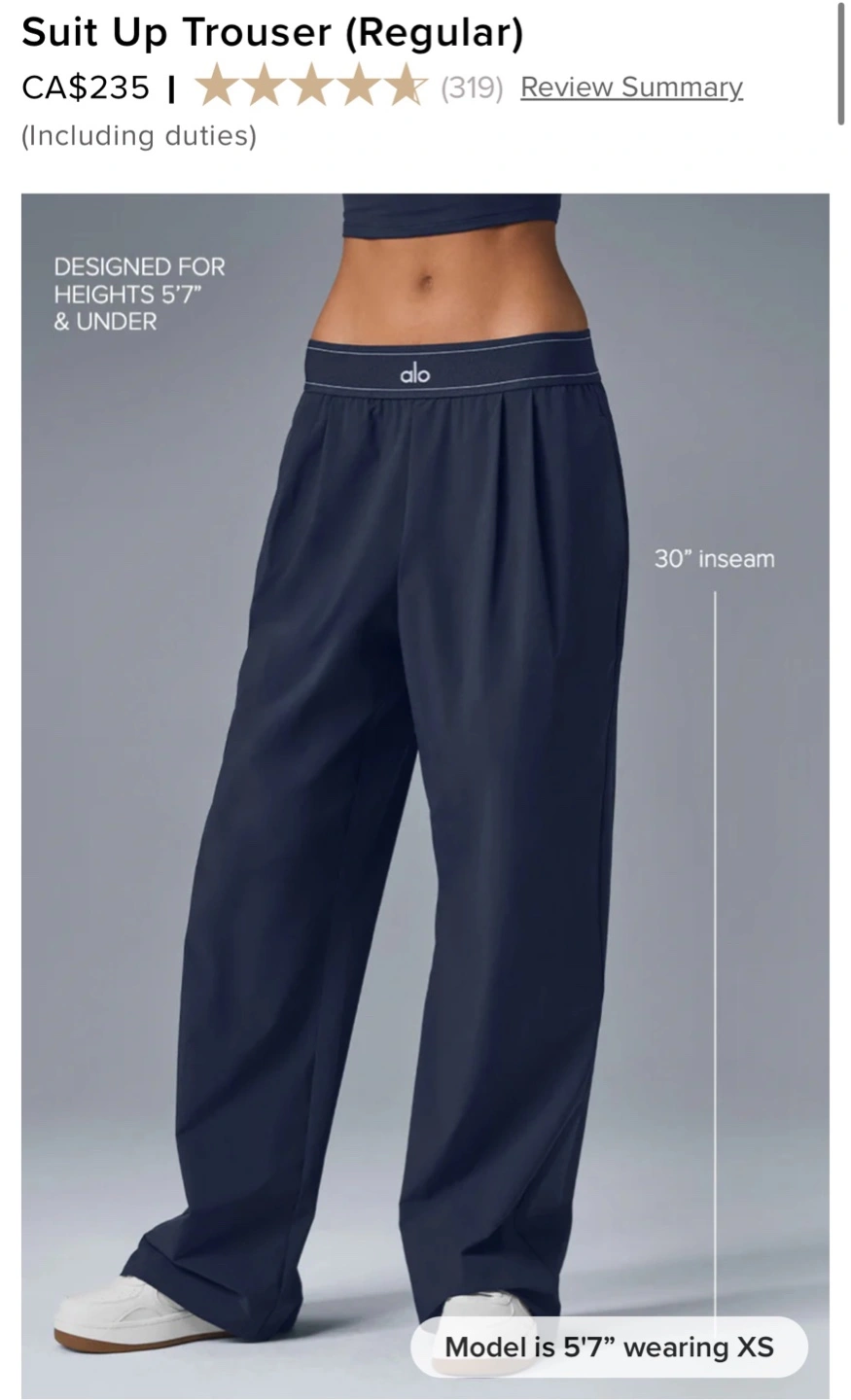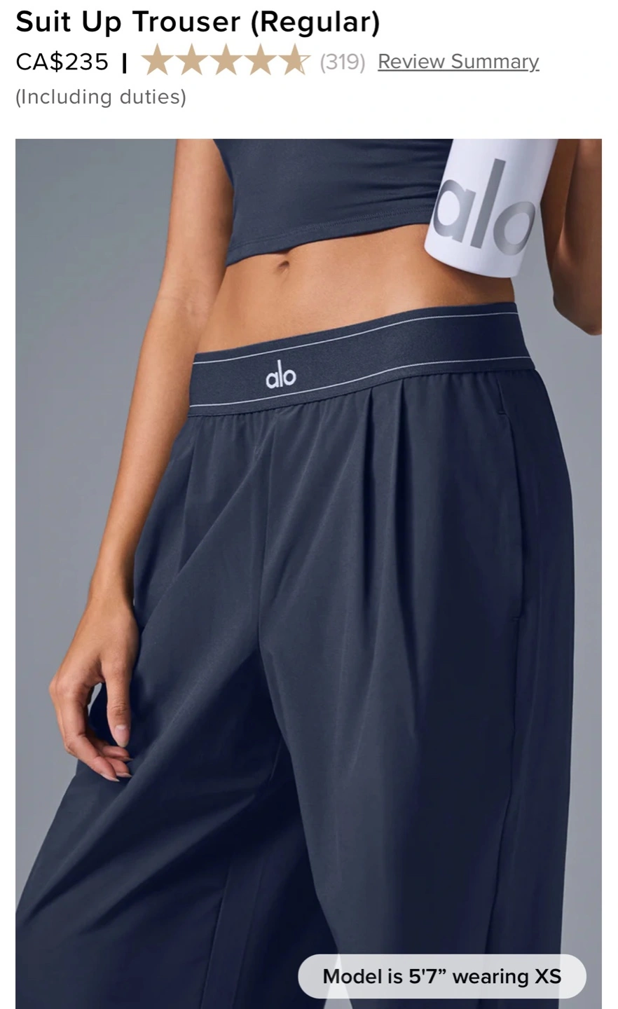 I'm selling a brand new pair of ALO Suit Up Trousers in navy! Brand new and authentic with tags. They are a regular fit with a 30" inseam. Retails for CA$235!