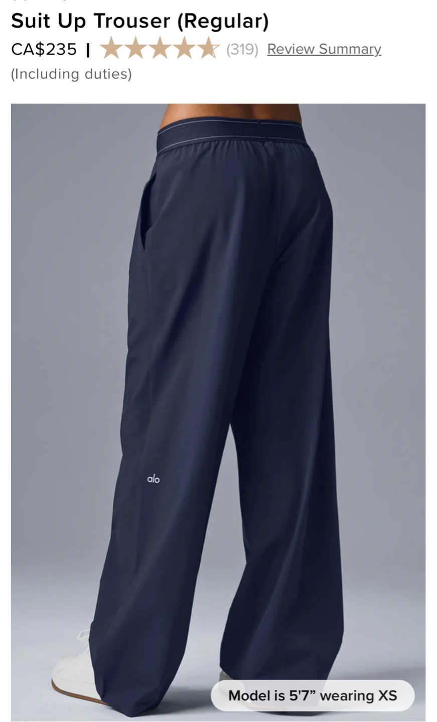 I'm selling a brand new pair of ALO Suit Up Trousers in navy! Brand new and authentic with tags. They are a regular fit with a 30" inseam. Retails for CA$235!