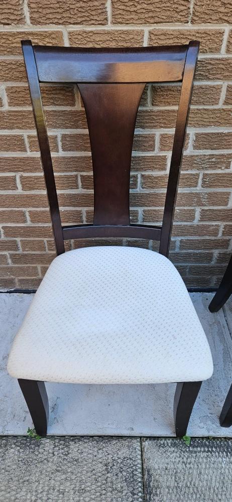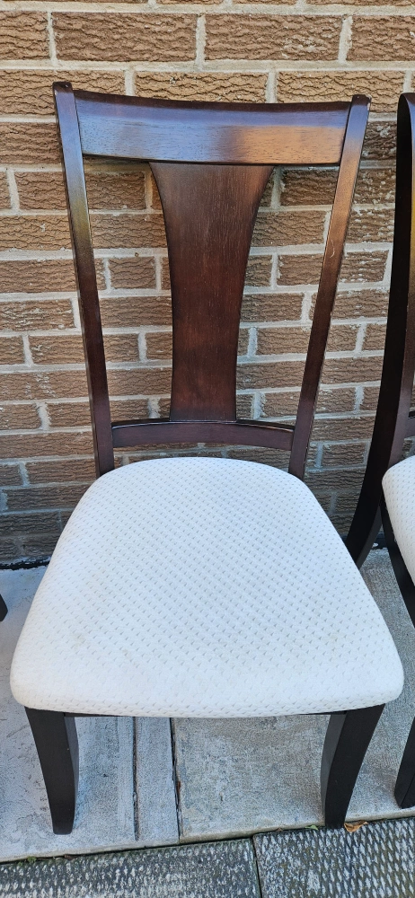 Set of 3 dining chairs with a dark wood finish and white fabric seats.