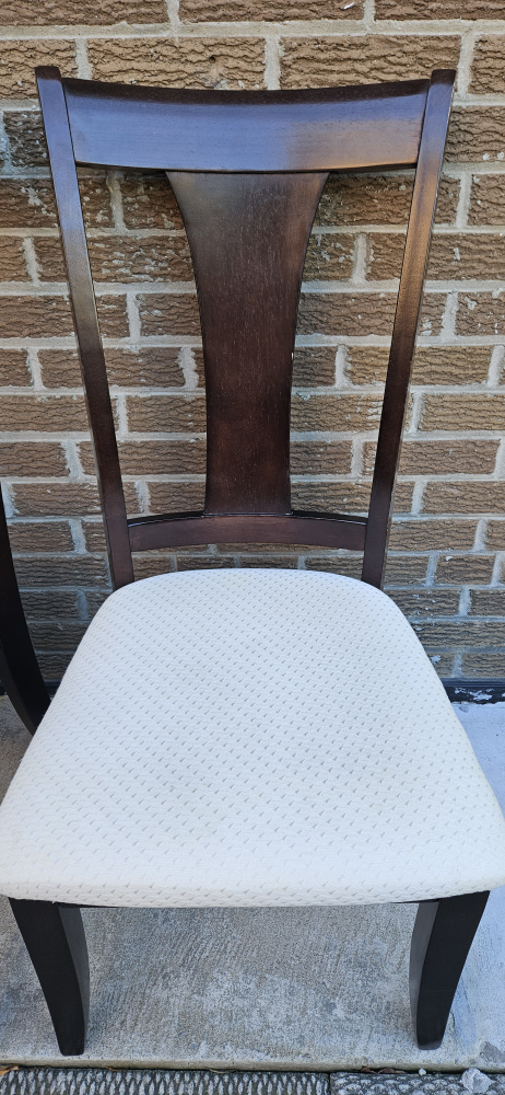 Set of 3 dining chairs with a dark wood finish and white fabric seats.