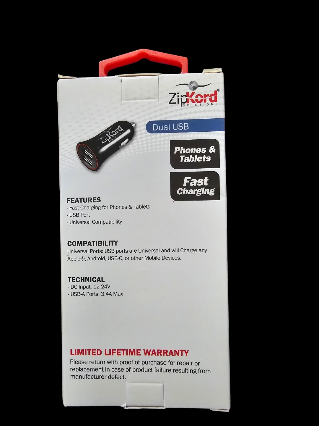 Selling a brand new ZipKord Dual USB car charger, still in its original packaging! It's designed for both phones and tablets, offering fast charging with universal compatibility. The USB ports are universal and will charge any Apple, Android, USB-C, or other mobile devices.