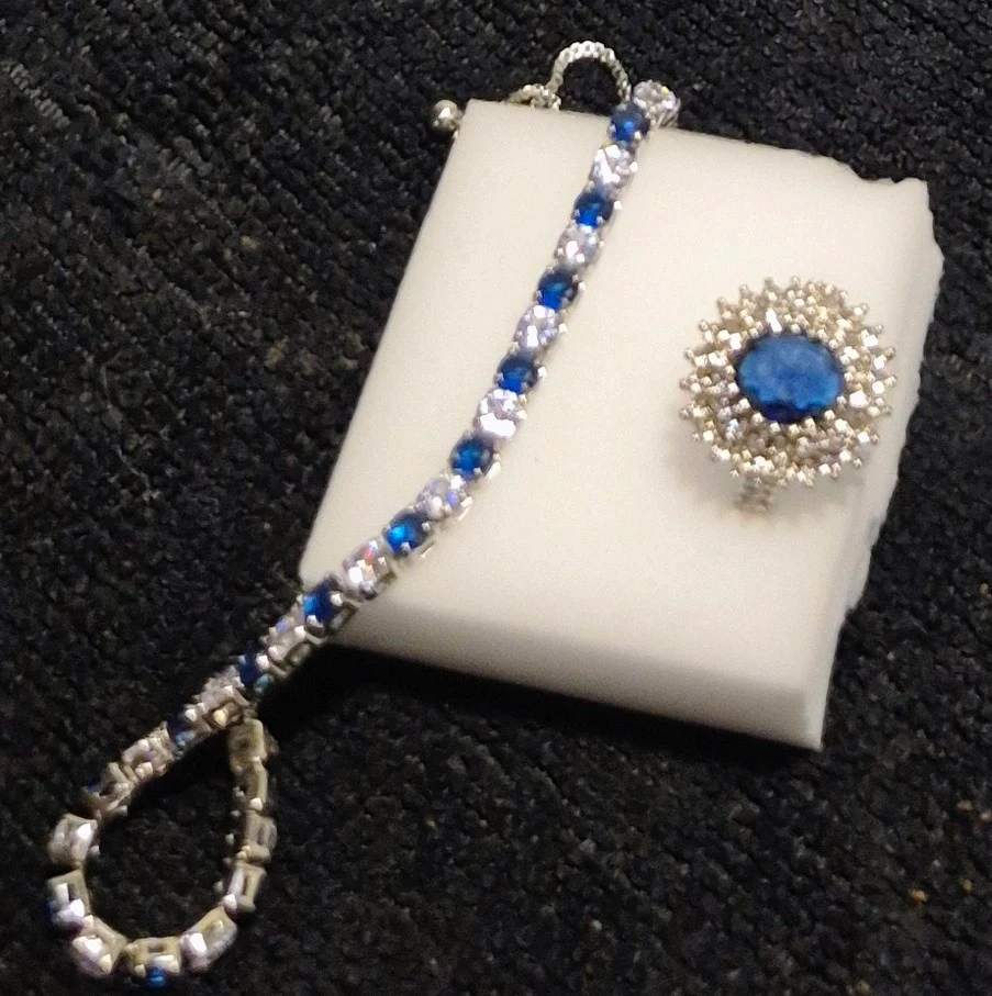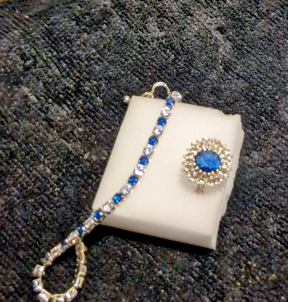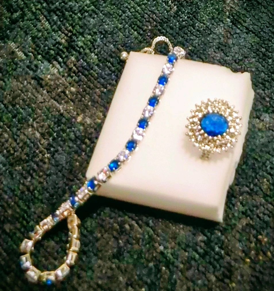 Selling a beautiful bracelet and ring set featuring blue and silver stones. The set is in great condition and would make a lovely addition to any jewellery collection!