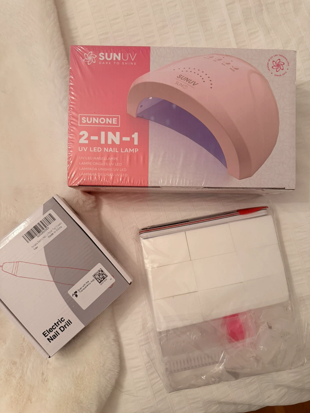 Selling a brand new SUNUV SUNONE 2-in-1 UV LED nail lamp! It comes with an electric nail drill. Also nail accessories like nail clips for removing the polish beforehand.