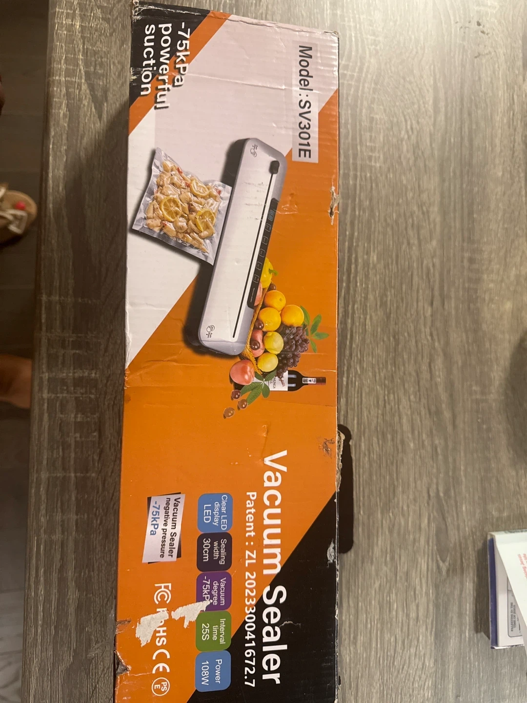 Selling a vacuum sealer, model SV301E. It features a clear LED display and a sealing width of 30cm. The vacuum degree is -75kPa, with an interval time of 25 seconds and a power of 108W. It also has a powerful -75kPa suction