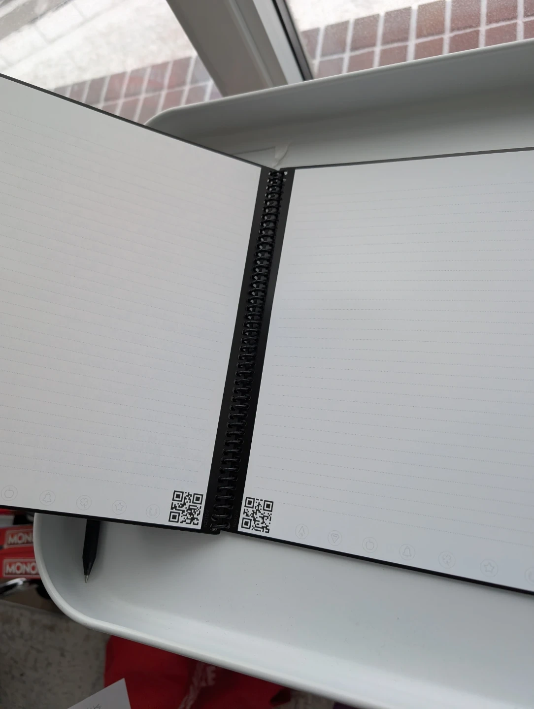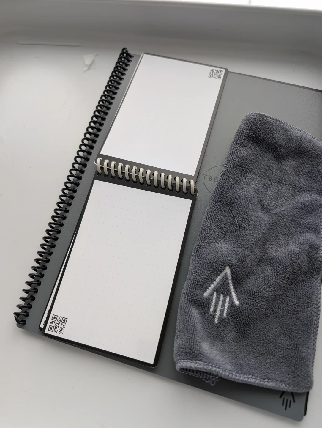 This is a grey Rocketbook reusable notebook. It comes with a microfiber cleaning cloth and a Pilot FriXion pen. It's great for students and professionals who want to reduce paper waste.