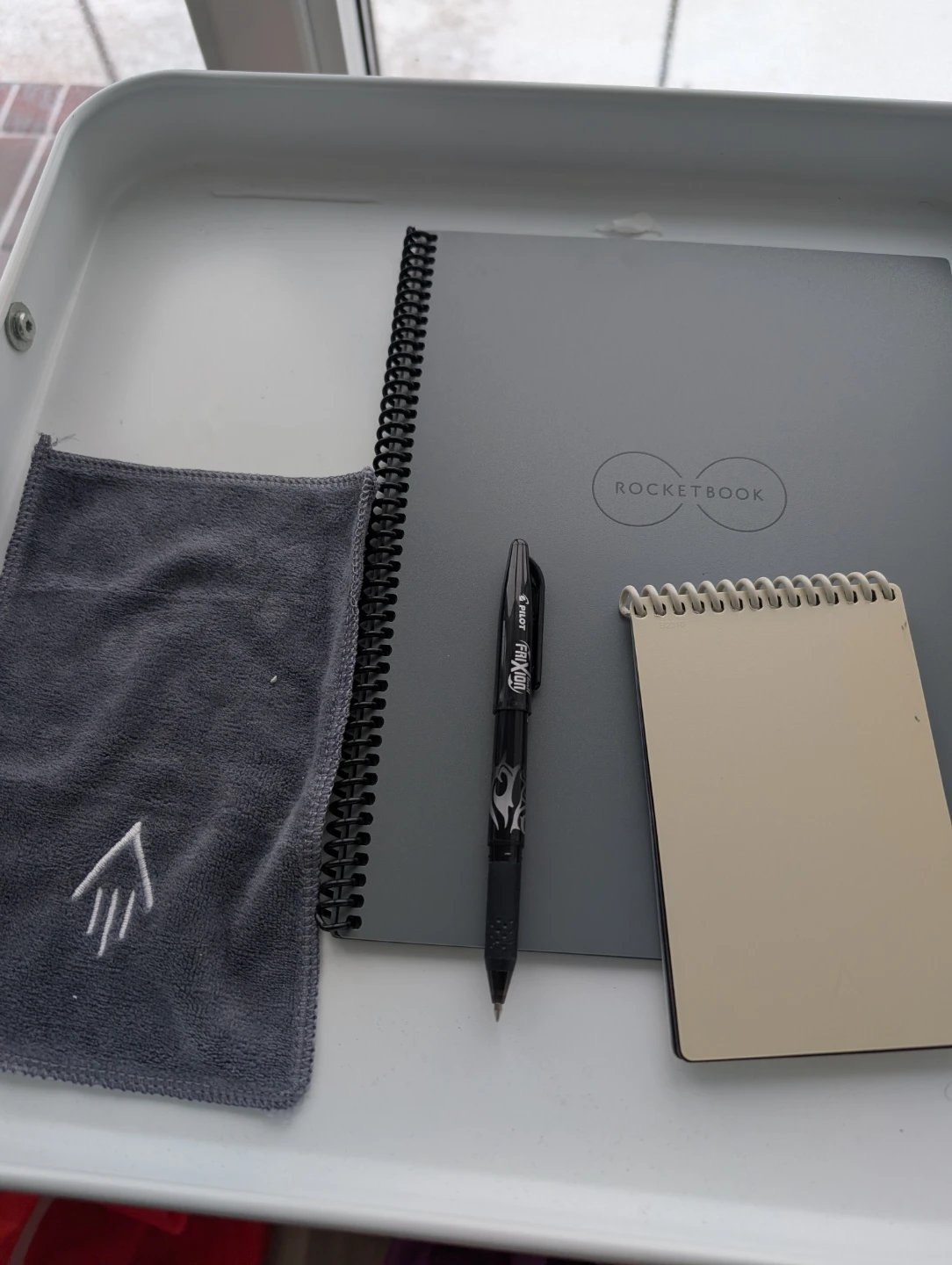 This is a grey Rocketbook reusable notebook. It comes with a microfiber cleaning cloth and a Pilot FriXion pen. It's great for students and professionals who want to reduce paper waste.