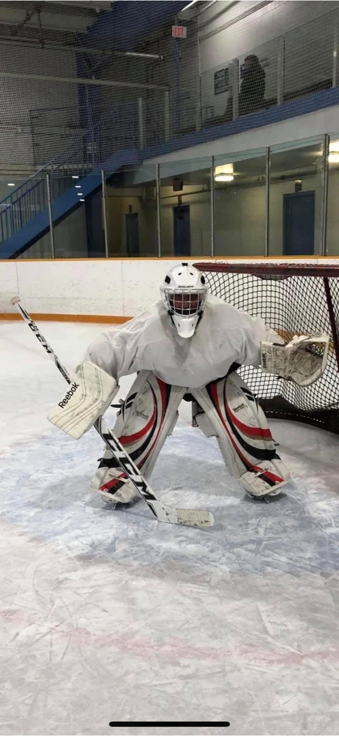 Full set of Reebok goalie pads along with the right hand blocker and left handed glove size medium to large and are professional-grade leg pads, built for excellent protection and mobility. Made for serious goalies ready to take on the crease! Pads size are 31+ all black and white goalie stick is Carey price and also is black and white and a goalie bag comes with it too
