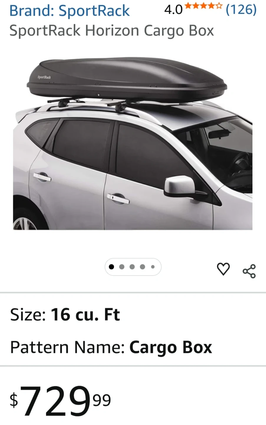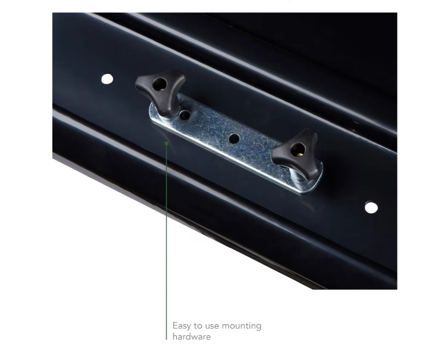 This is a black SportRack Horizon cargo box with 16 cubic feet of storage space. It's made of durable plastic and includes easy-to-use mounting hardware. Dimensions are 75.5" L x 33" W x 16.25" H.